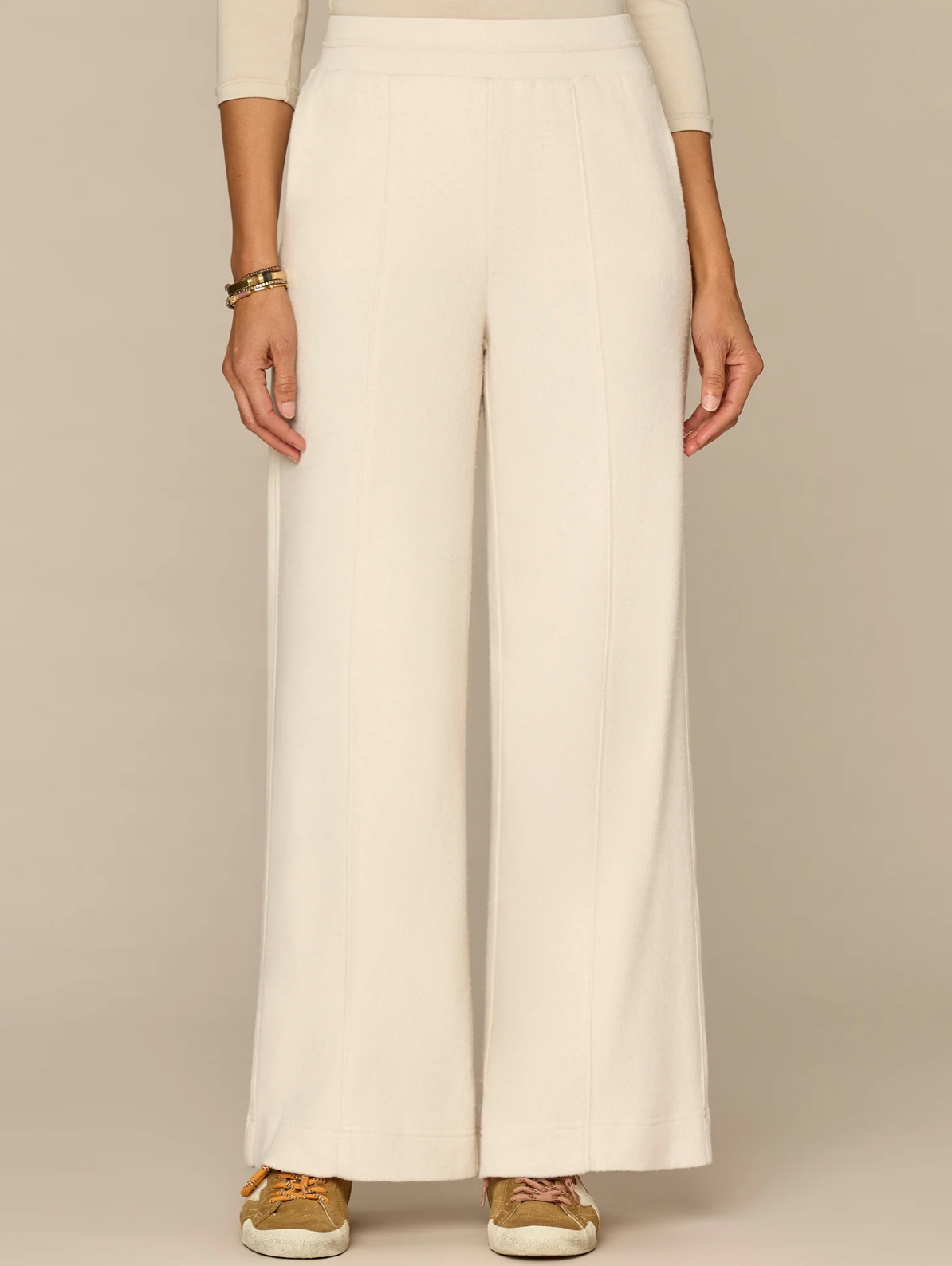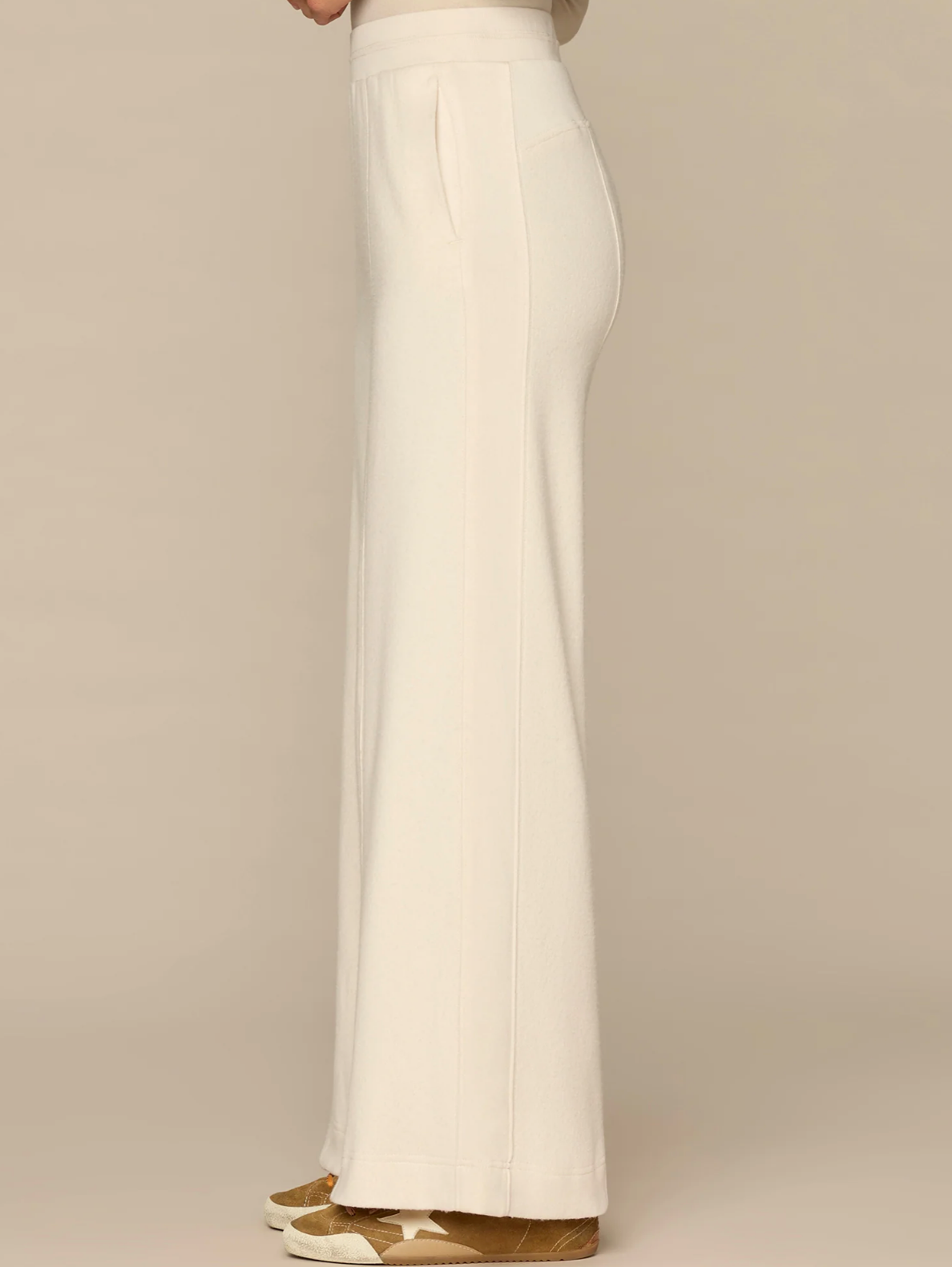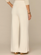 This Wide Leg knit pant is fitted through the hips with a relaxed, wide opening through the legs. Made with a round up yoke, banded waist, contrast side panels, and "Ab"leisure design details that strike a balance between comfortable and polished.