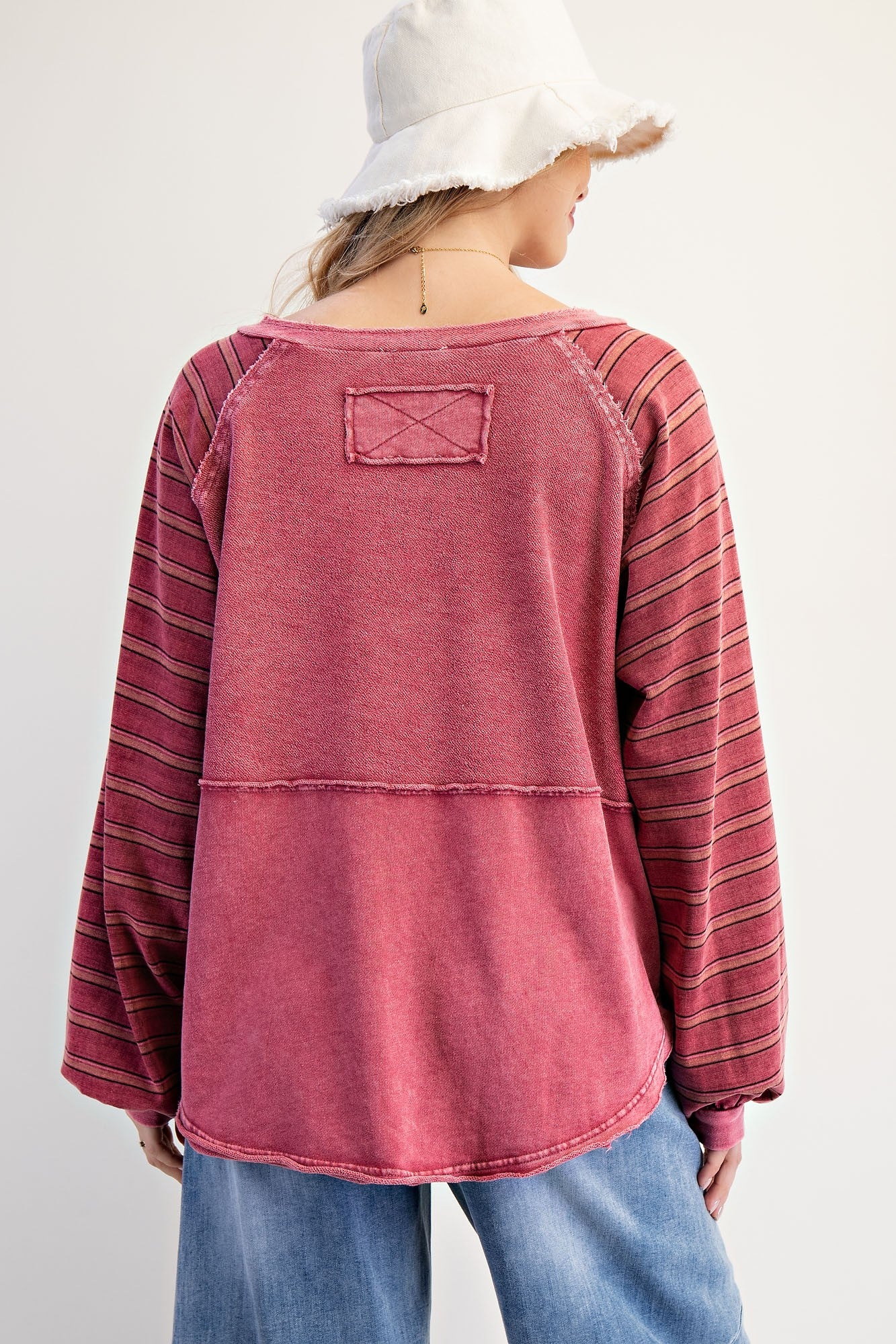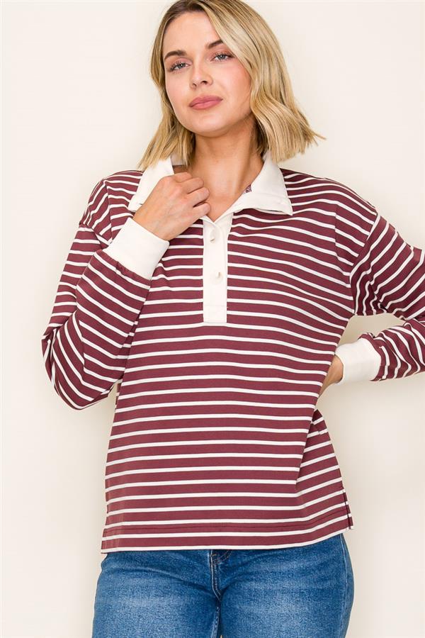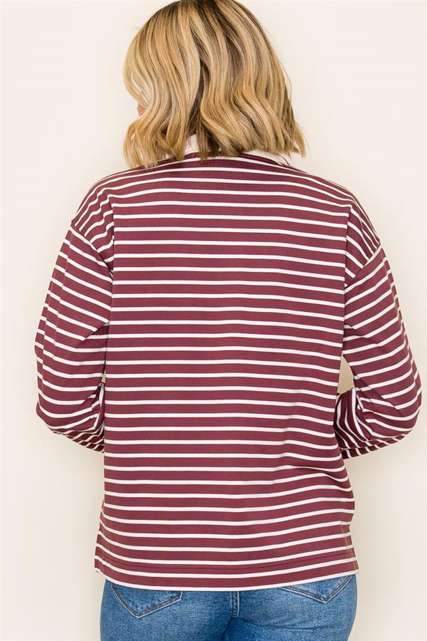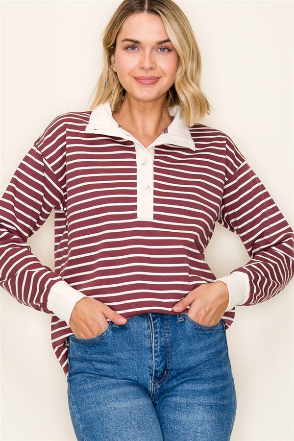 High Collar Half Button Long Sleeve Striped Sweatshirt