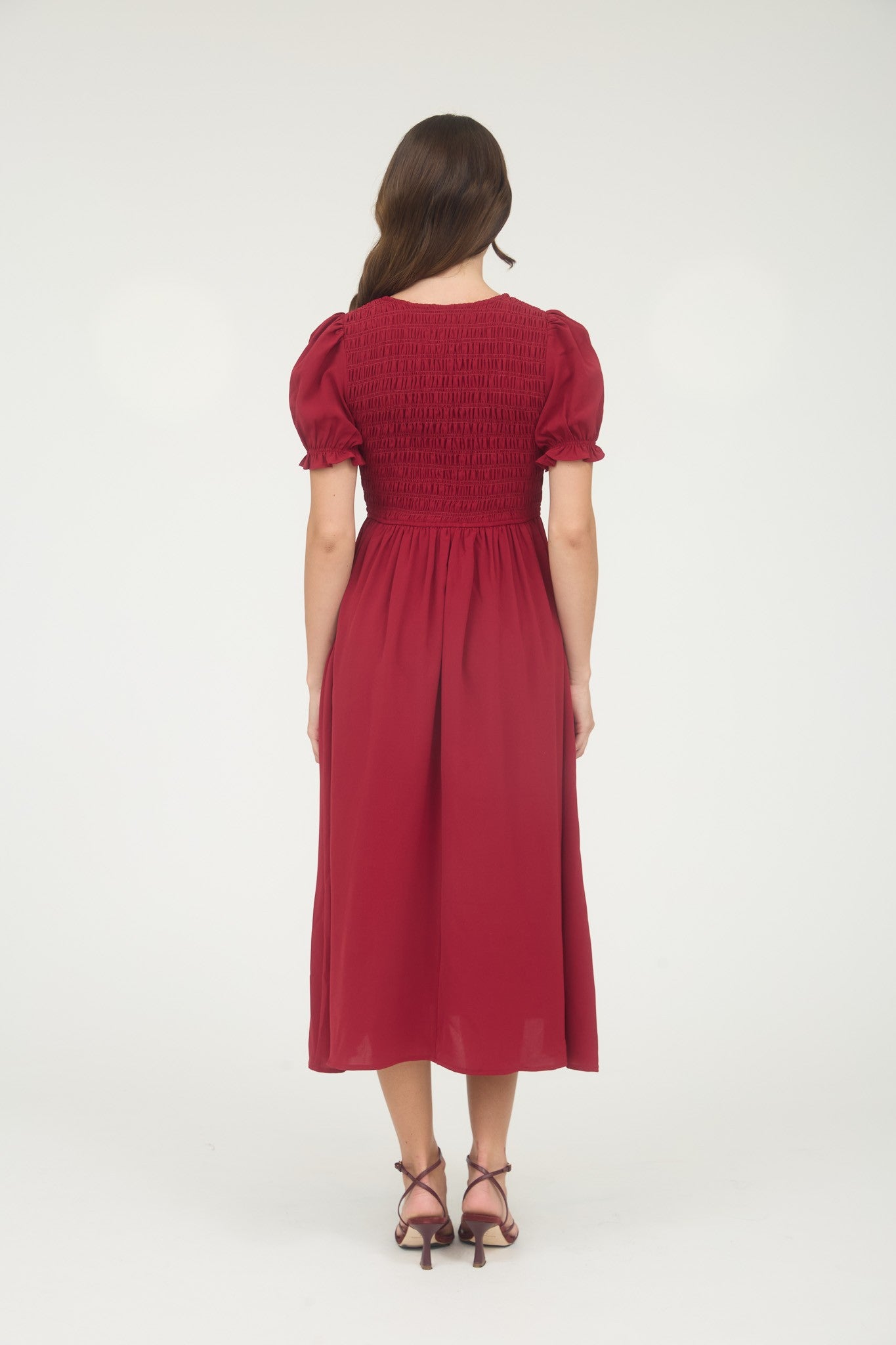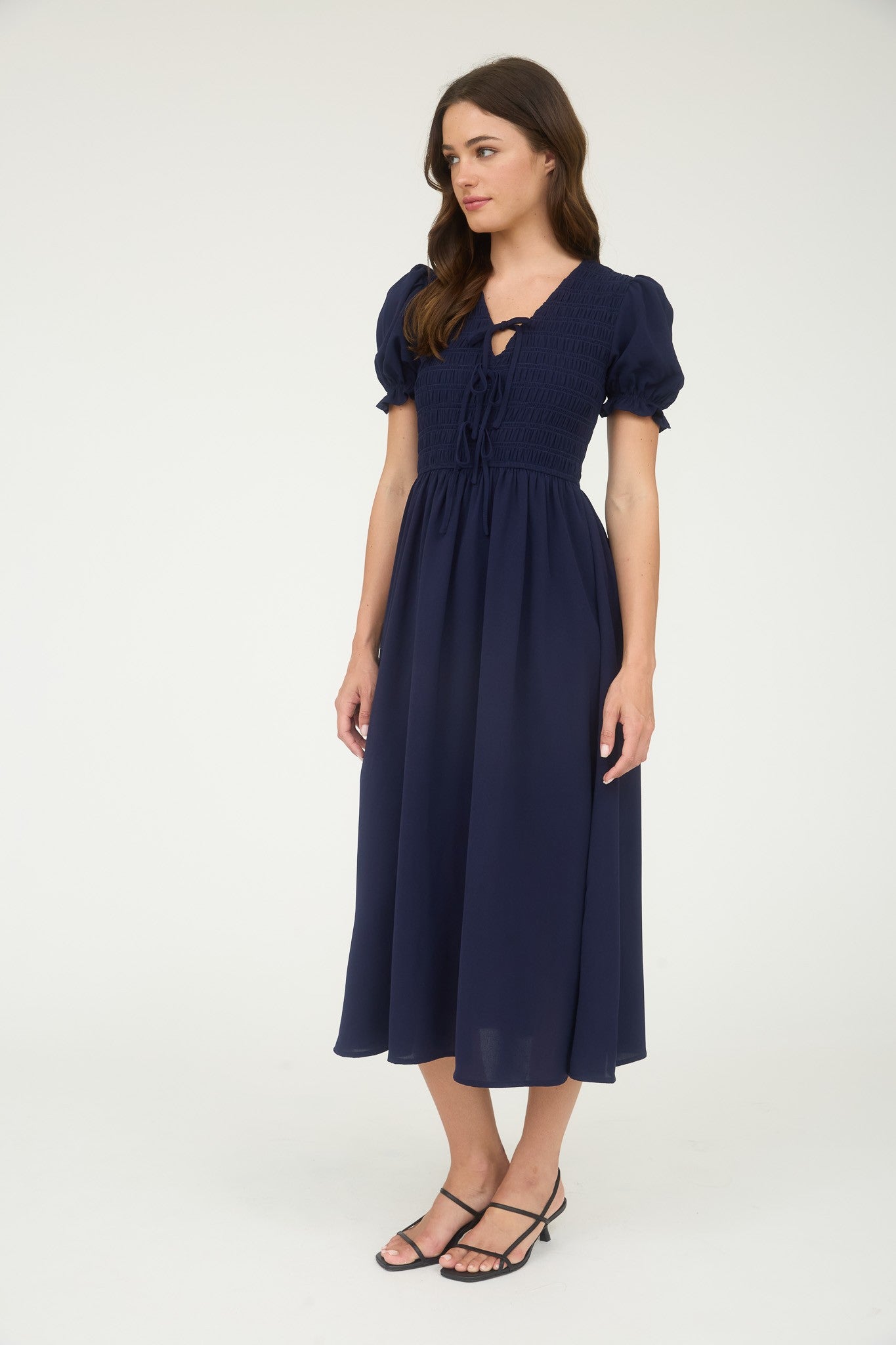 V Neck Front Tie Smocked Puff Sleeve Midi Dress