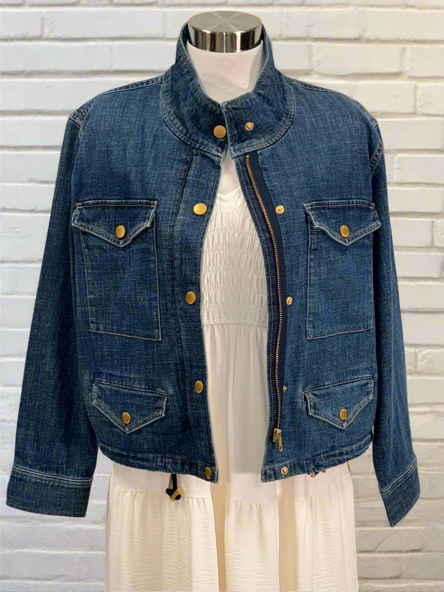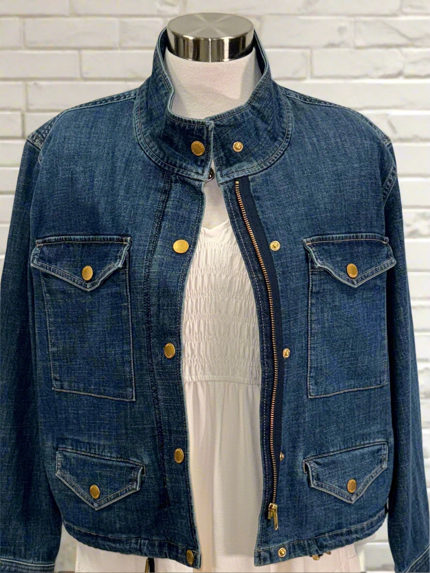 This cropped denim cargo jacket brings a fun twist to your wardrobe with its playful cut and practical pockets. Perfect for layering, it adds a cool, casual vibe while keeping essentials close at hand. Whether you're out exploring or just hanging with friends, this jacket keeps your style fresh and your look effortlessly cool.