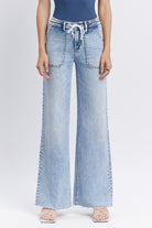 These high-rise wide-leg jeans feature a comfortable drawstring waistband, combining style with adjustable fit. The elevated waistline enhances silhouette definition, while the wide-leg cut offers ease of movement and a modern, relaxed look. Crafted for both comfort and fashion, they are ideal for versatile everyday wear.
