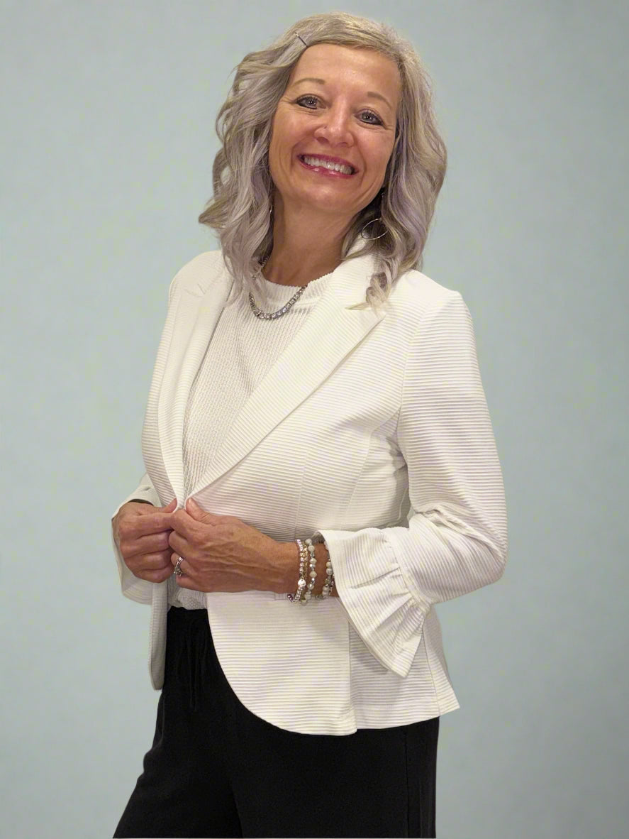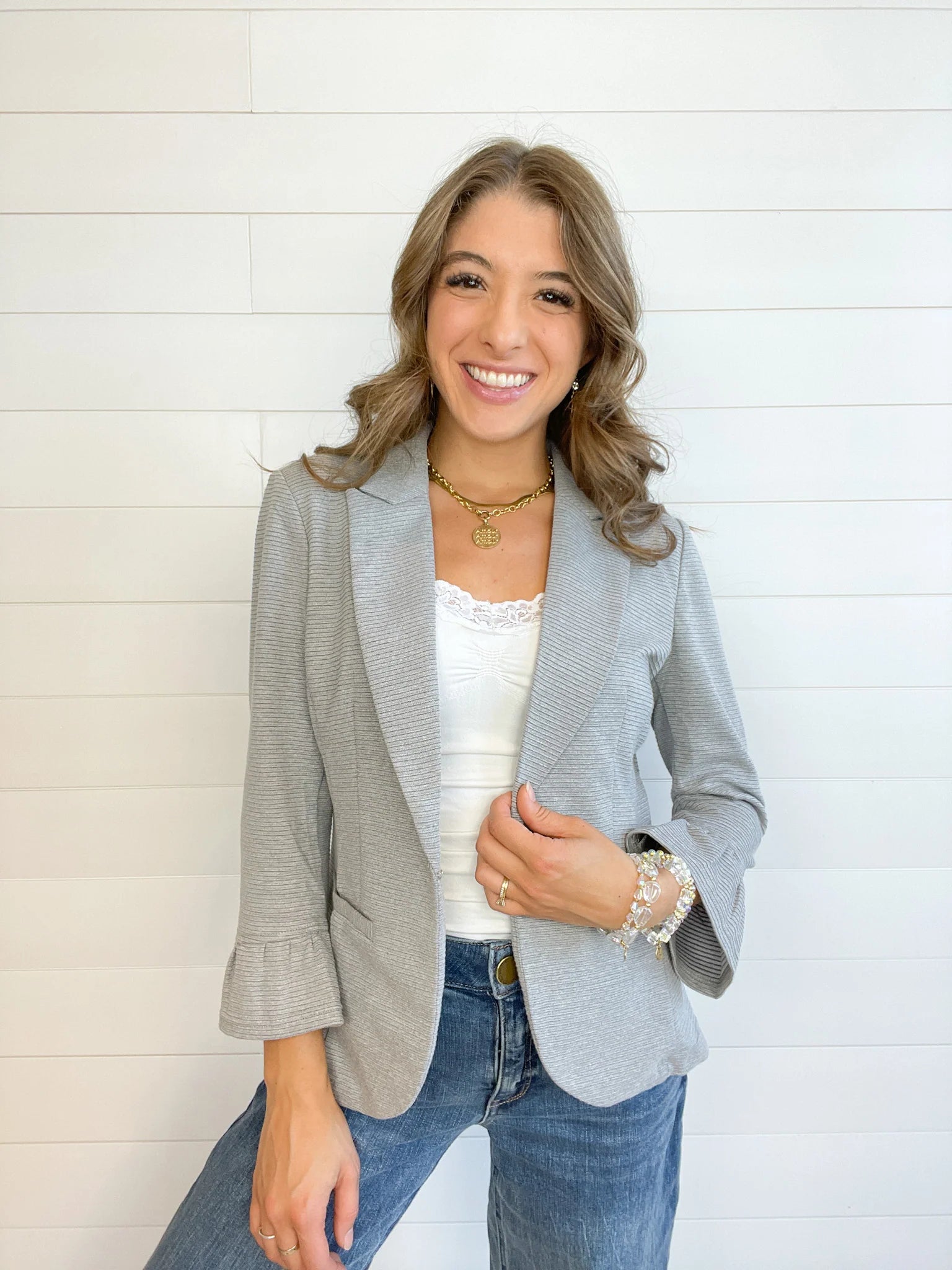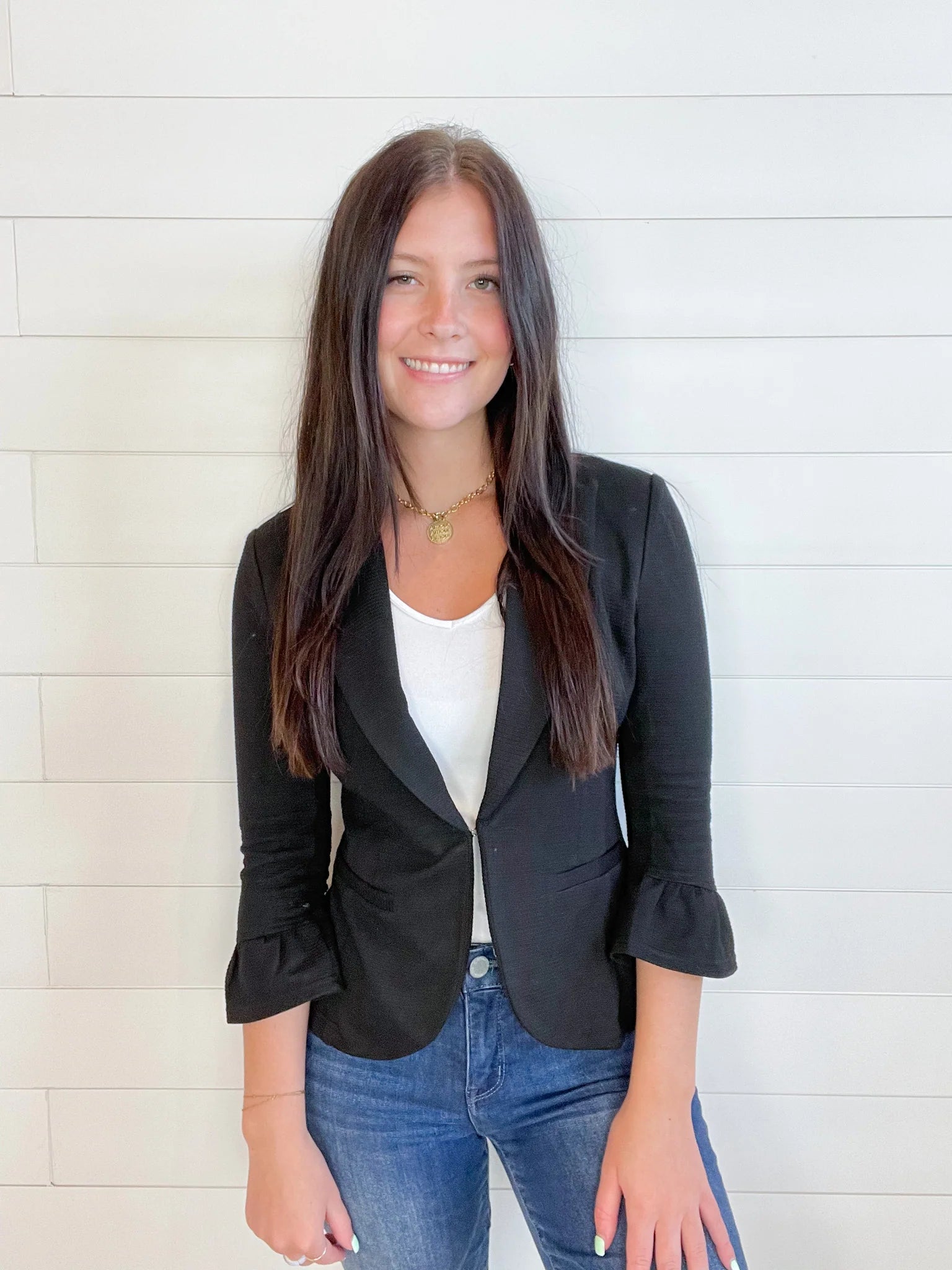 Add a flirty twist to your wardrobe with this 3/4 ruffle sleeve solid blazer! The playful ruffle detail on the sleeves brings fun and flair to a classic silhouette, making it perfect for days when you want to look sharp but feel fabulous. Whether you're heading to a meeting or out for brunch, this blazer adds a splash of personality to any outfit.