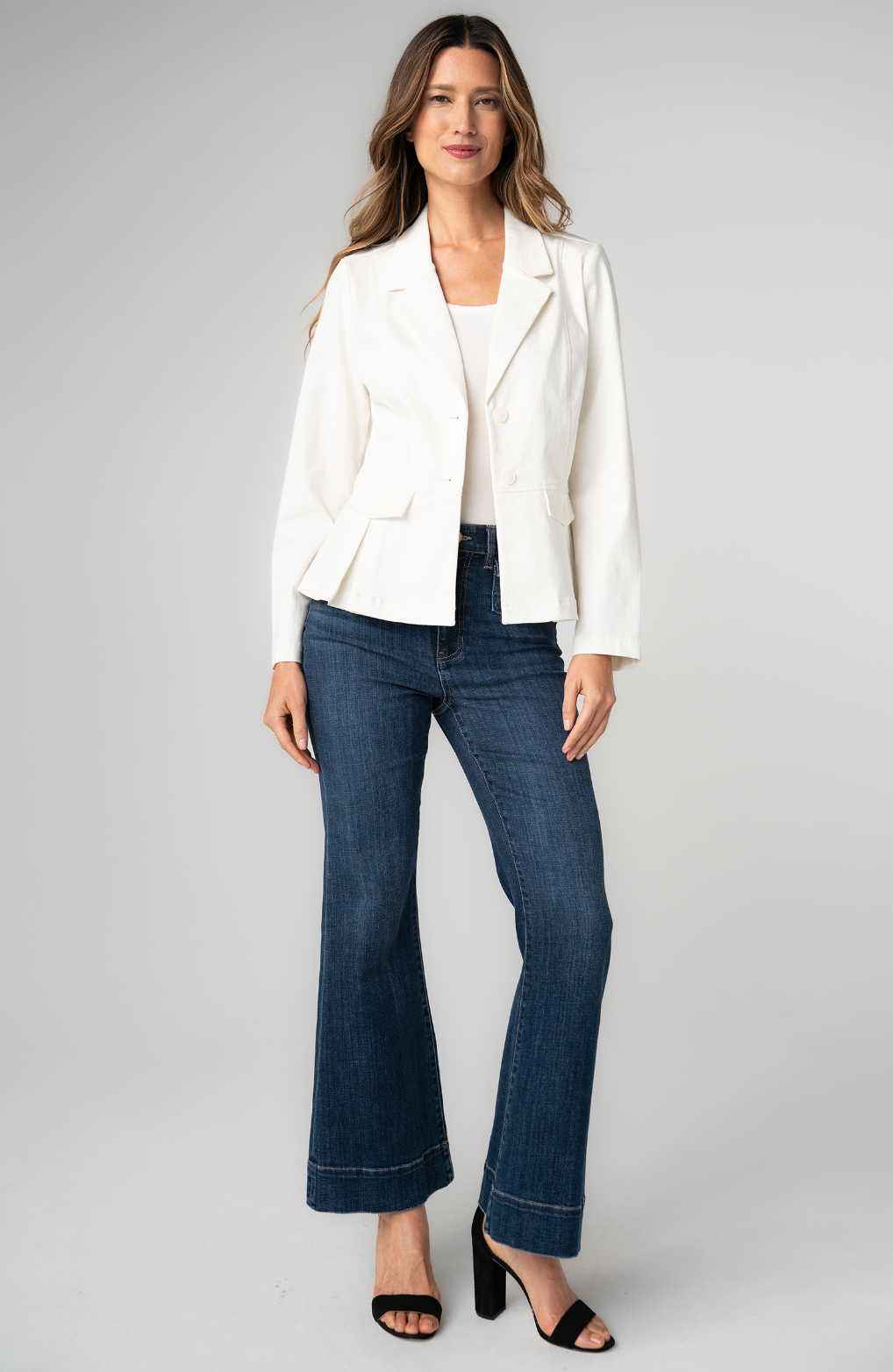 Tailored structure meets contemporary silhouette in this polished peplum blazer. The defined waist and flared hem create flattering proportions while maintaining the crisp, professional lines of a classic blazer. Perfect for elevating workwear or dressing up weekend occasions with understated sophistication.