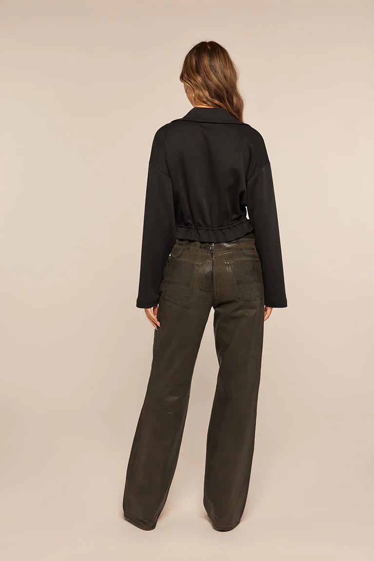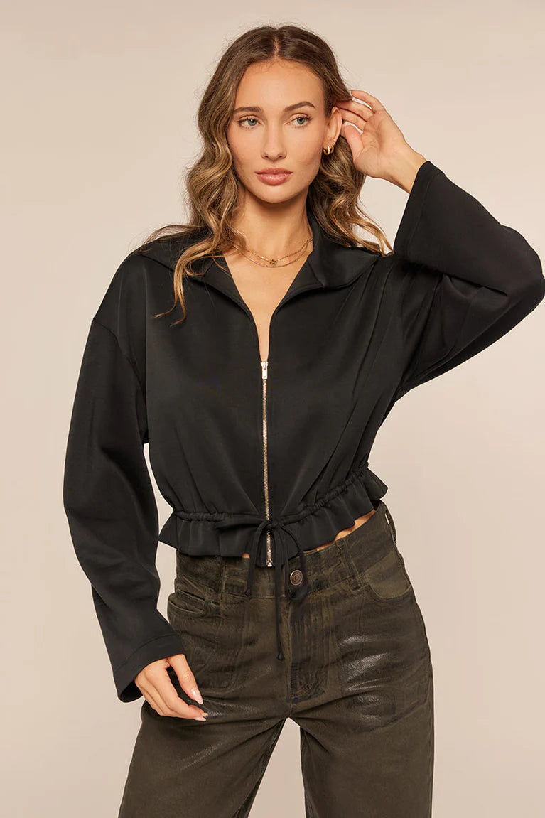 This zip-up jacket shines with shiny silver hardware and is crafted from a cozy, stretchy fabric. It sports a timeless collar and a drawstring waist, letting you tailor the fit just right.