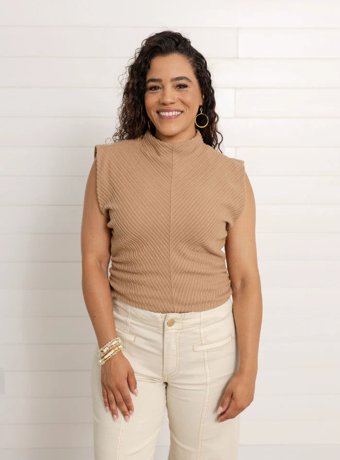 Extended cap slv funnel nk mitered knit top w/rouching