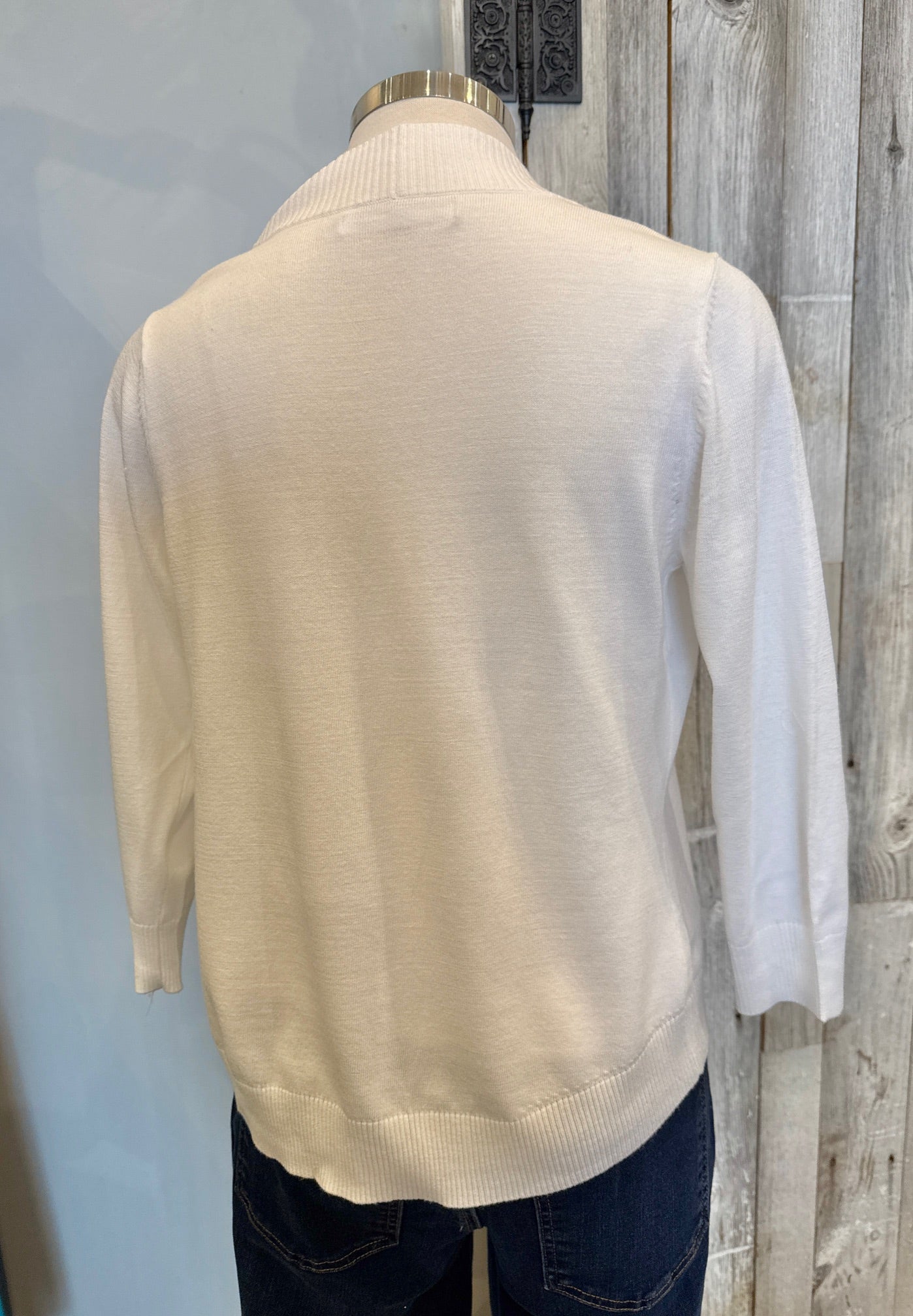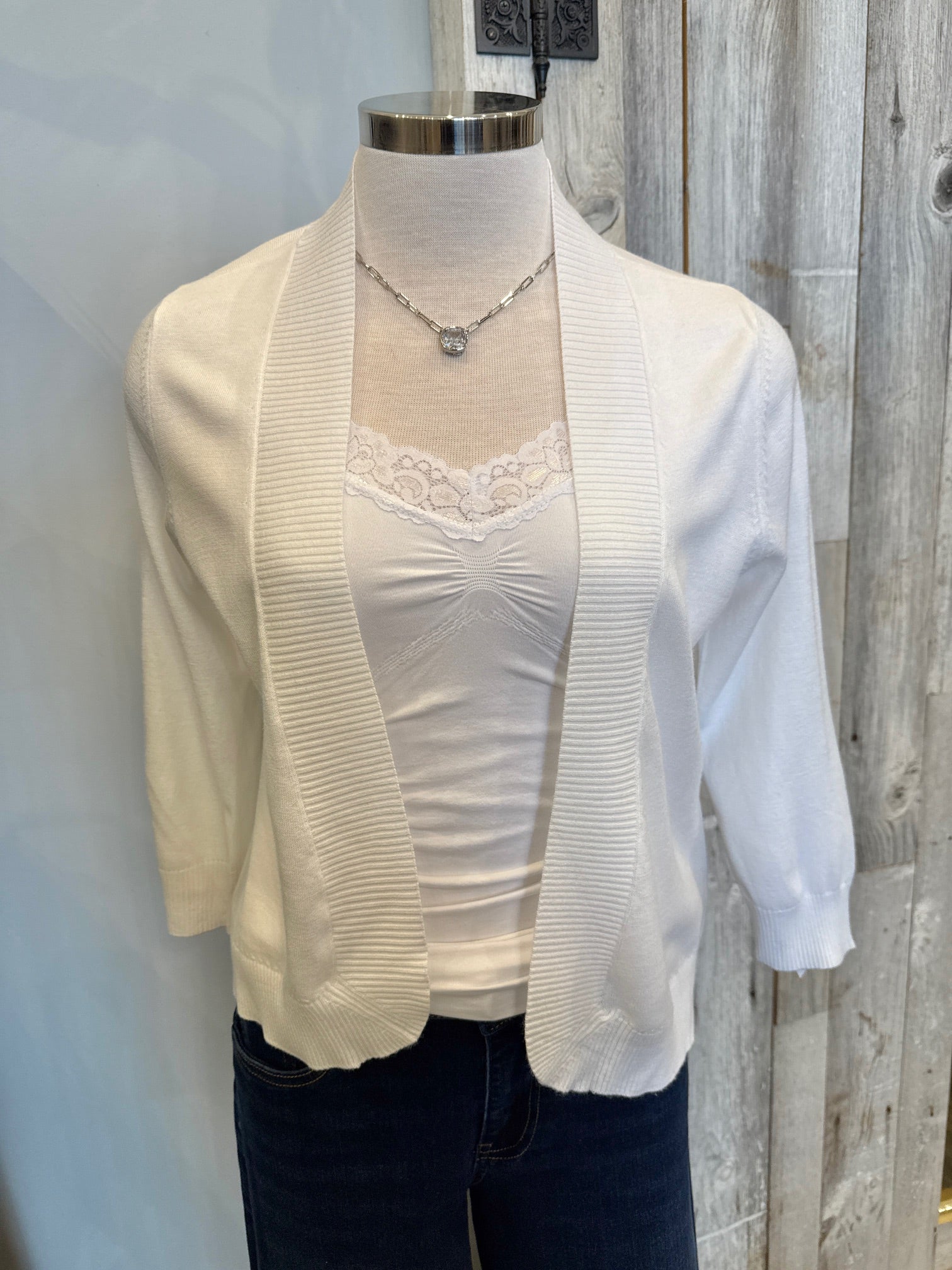 Featuring ribbed trim and open front styling, this 3/4 sleeve sweater is ideal to add to your wardrobe!