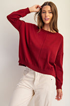 This long sleeve knit sweater top features a distinctive center seam detail that adds a refined structural element to its classic silhouette. Crafted from soft, breathable knit fabric, it offers comfortable wear throughout the day while maintaining a polished appearance. Ideal for layering or wearing on its own, this top delivers both style and versatility for elevated casual or office ensembles.