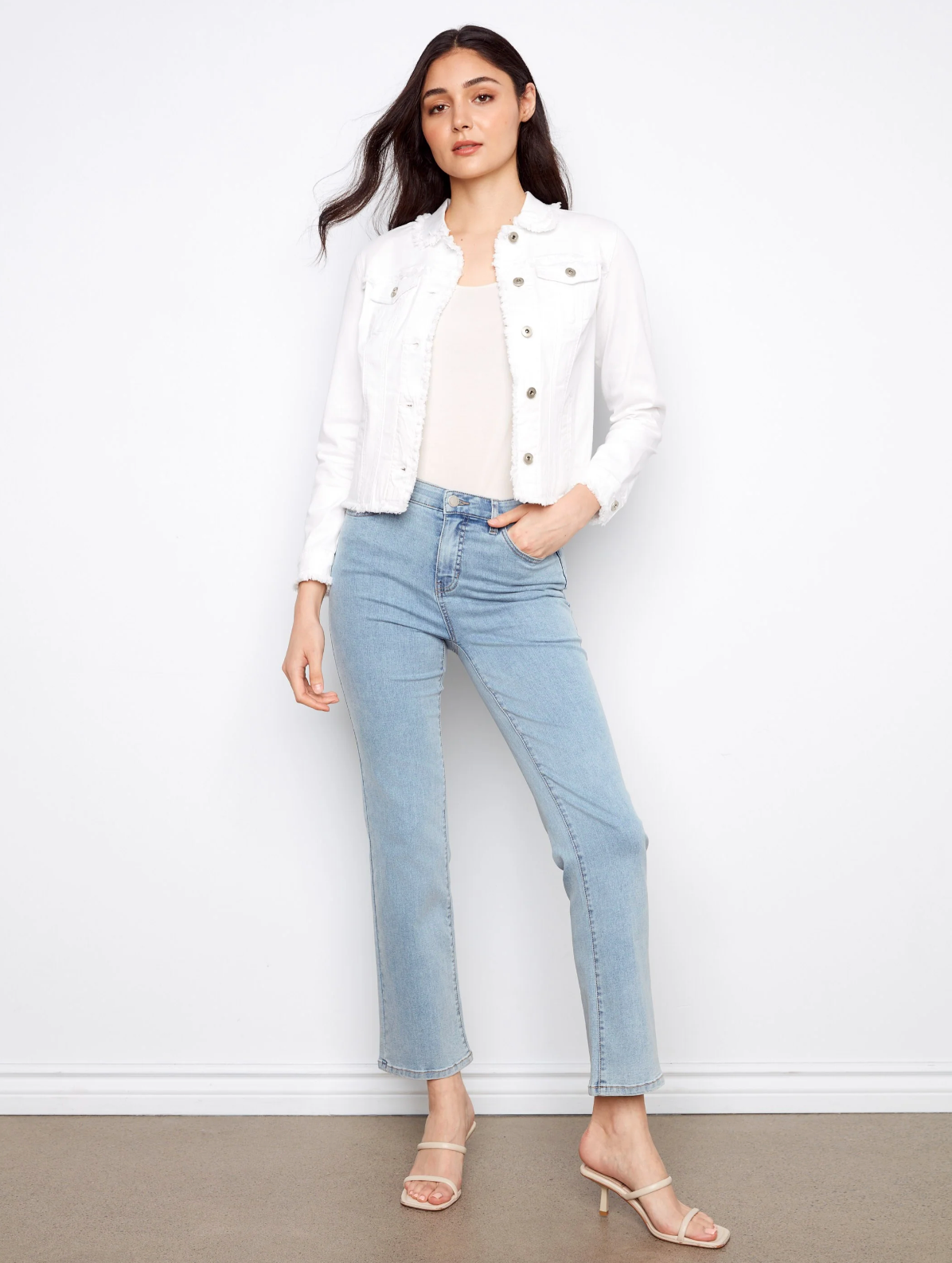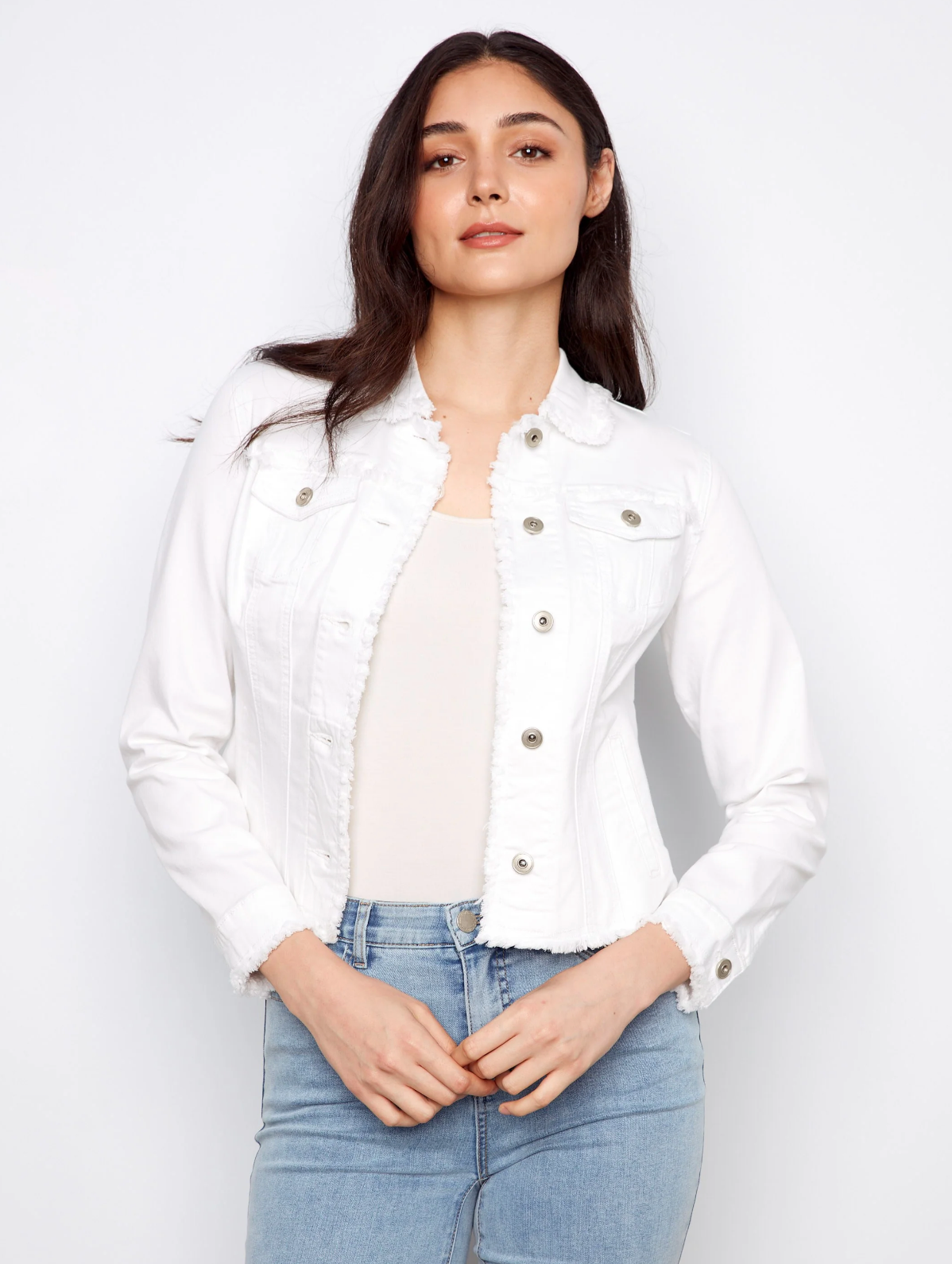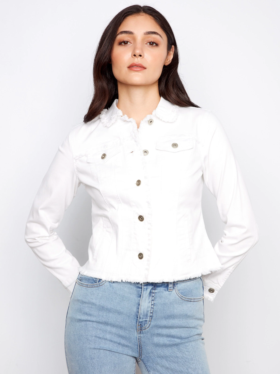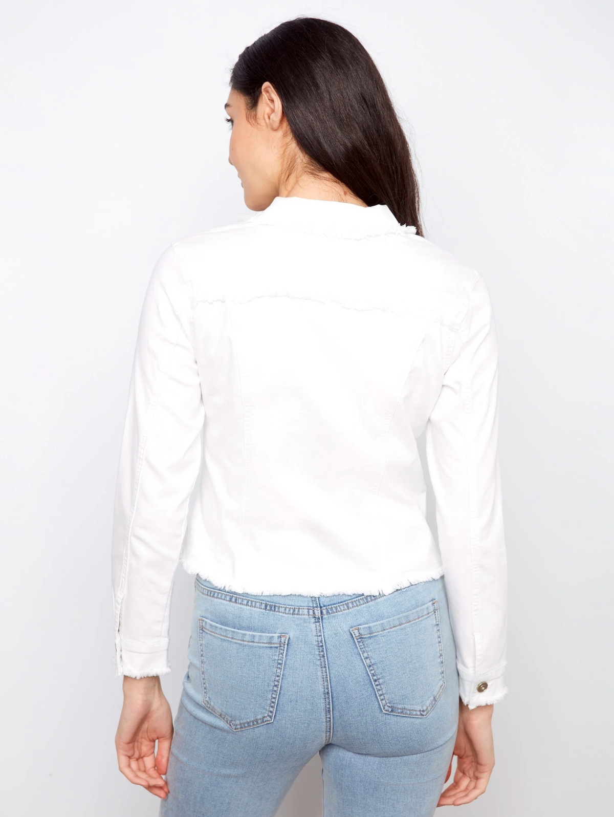 A versatile layering essential with modern edge appeal. This stretch twill jacket features signature frayed detailing that adds movement and visual interest to any outfit. The structured fit works seamlessly over dresses, tees, or sweaters, while the soft stretch fabric ensures all-day comfort. Perfect for transitional seasons or as a lightweight layer year-round.