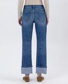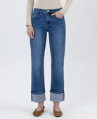 Comfort stretch denim, high rise waist, single cuff hem, ankle length, straight jeans