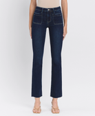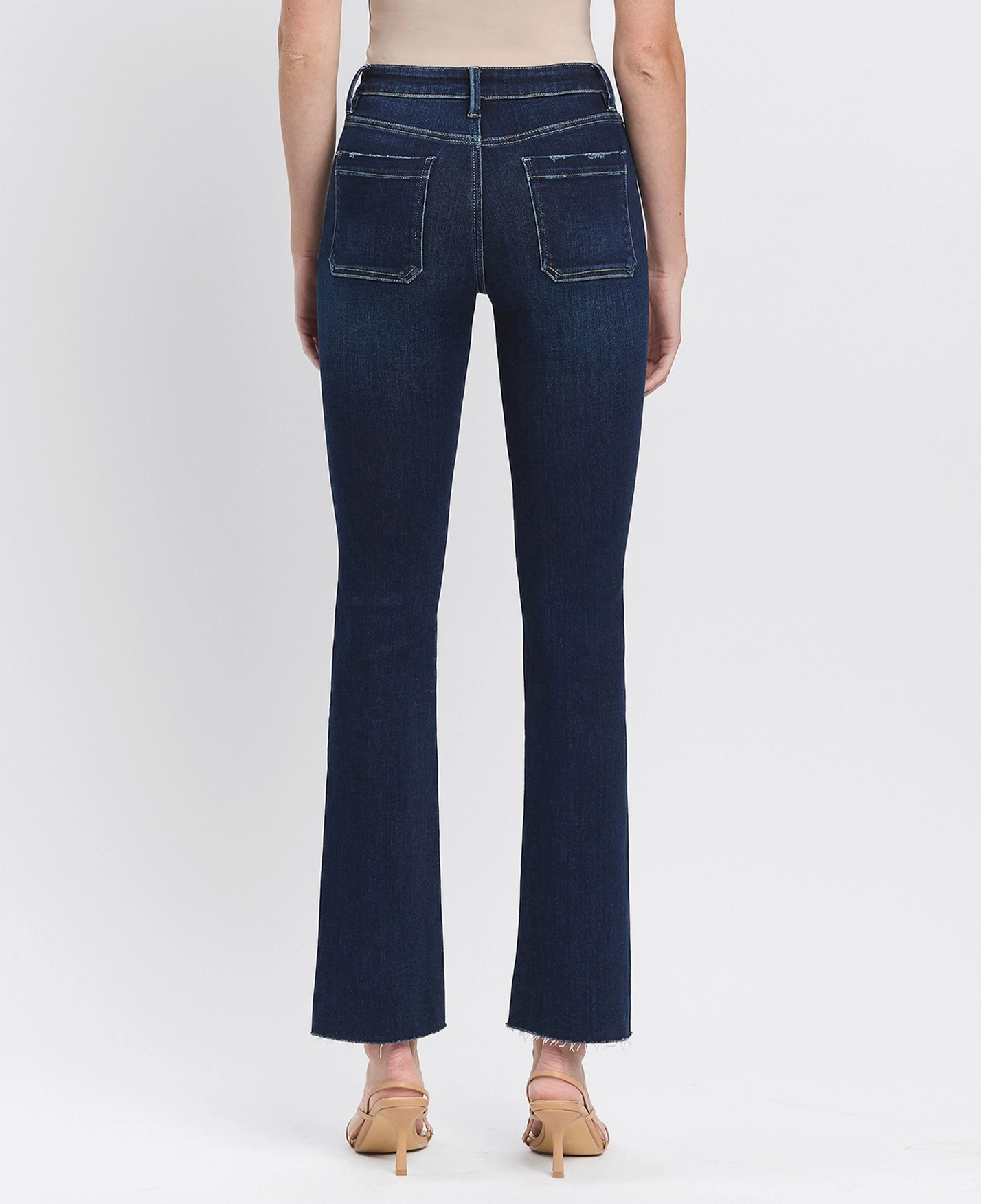 Comfort stretch denim, high rise waist, front patch pocket, clean cut raw hem, full length, mini bootcut jeans.