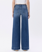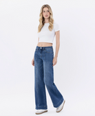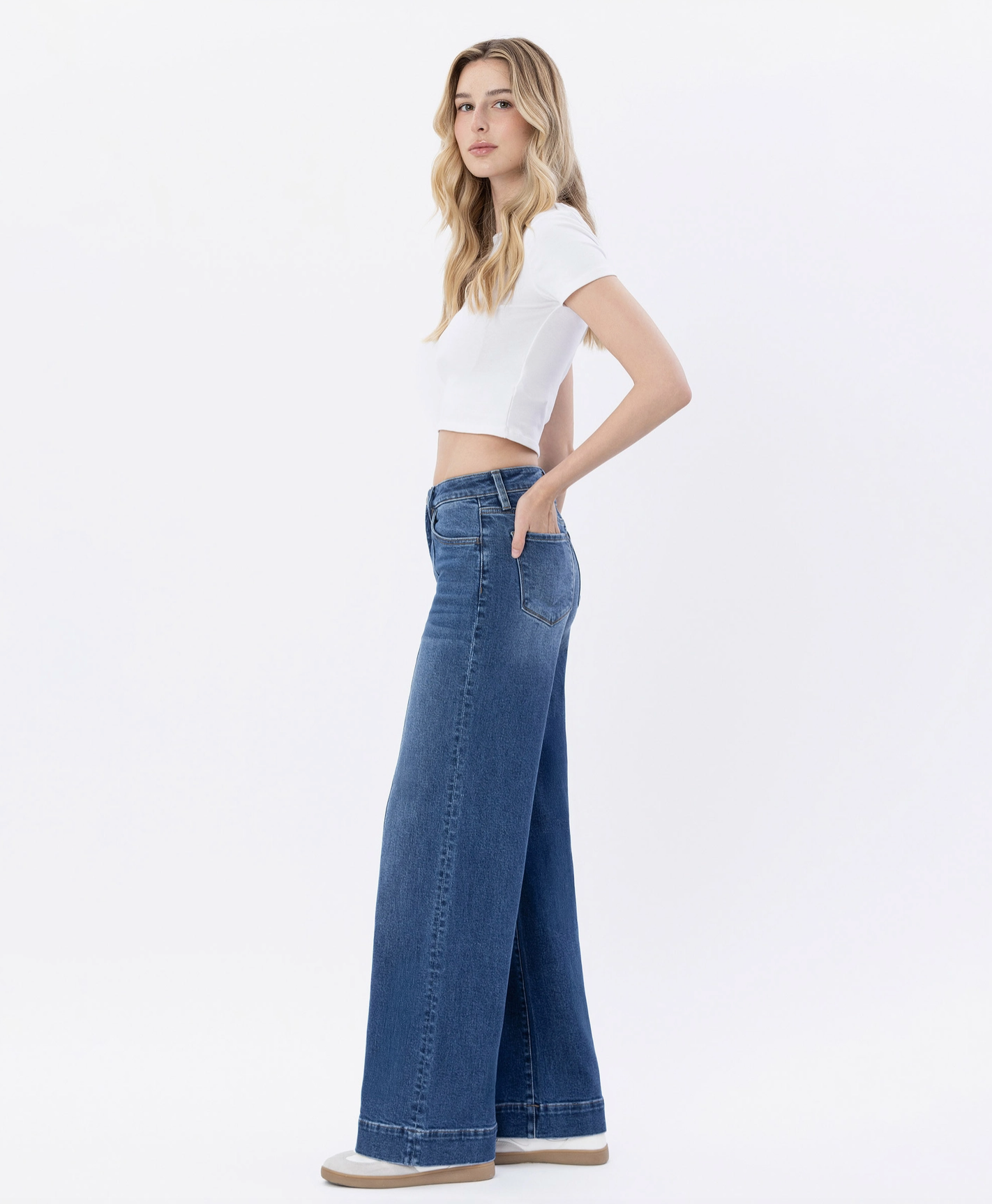 Comfort stretch denim, high rise waist, trouser hem, full length, wide leg jeans.