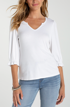 The not so basic basic. This elbow sleeve tee comes with a little wink at the cuff thanks to a notch detail that gives everyday styling a playful edge. Mini rib texture keeps things sleek while the V neck brings just the right amount of polish.