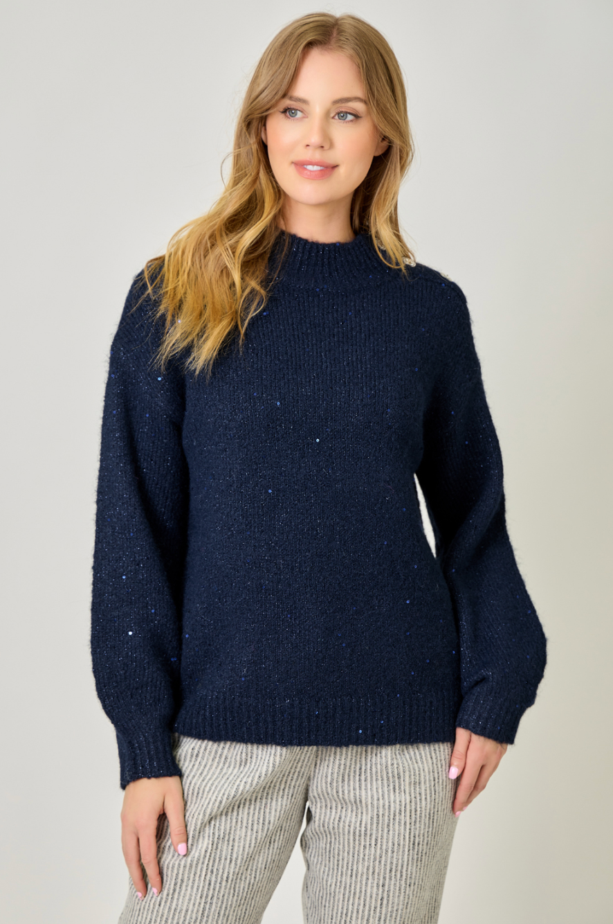 Add a dash of sparkle to your wardrobe with this Mock Neck Sparkle Sweater. Featuring fabric woven with navy lurex threads and sprinkled with tiny royal blue sequins, it catches the light with every move. Perfect for turning everyday into a little celebration.