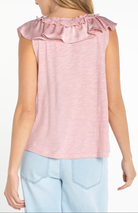 Sleek sleeveless silhouette with a statement ruffle front detail that adds movement and visual interest. Perfect for layering or wearing solo, this versatile piece transitions seamlessly from office to evening. The structured design flatters while the ruffles create dimension without bulk.