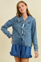 This oversized denim jacket features a distinctive quilted design that provides subtle warmth and texture without bulk. The ruffled collar adds a refined, feminine touch, elevating classic denim styling. A carefully placed patch enhances the jacket’s unique character while maintaining its versatile appeal. Ideal for layering, this jacket combines comfort and fashion-forward details for a stylish, expert-approved outerwear option.