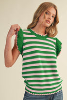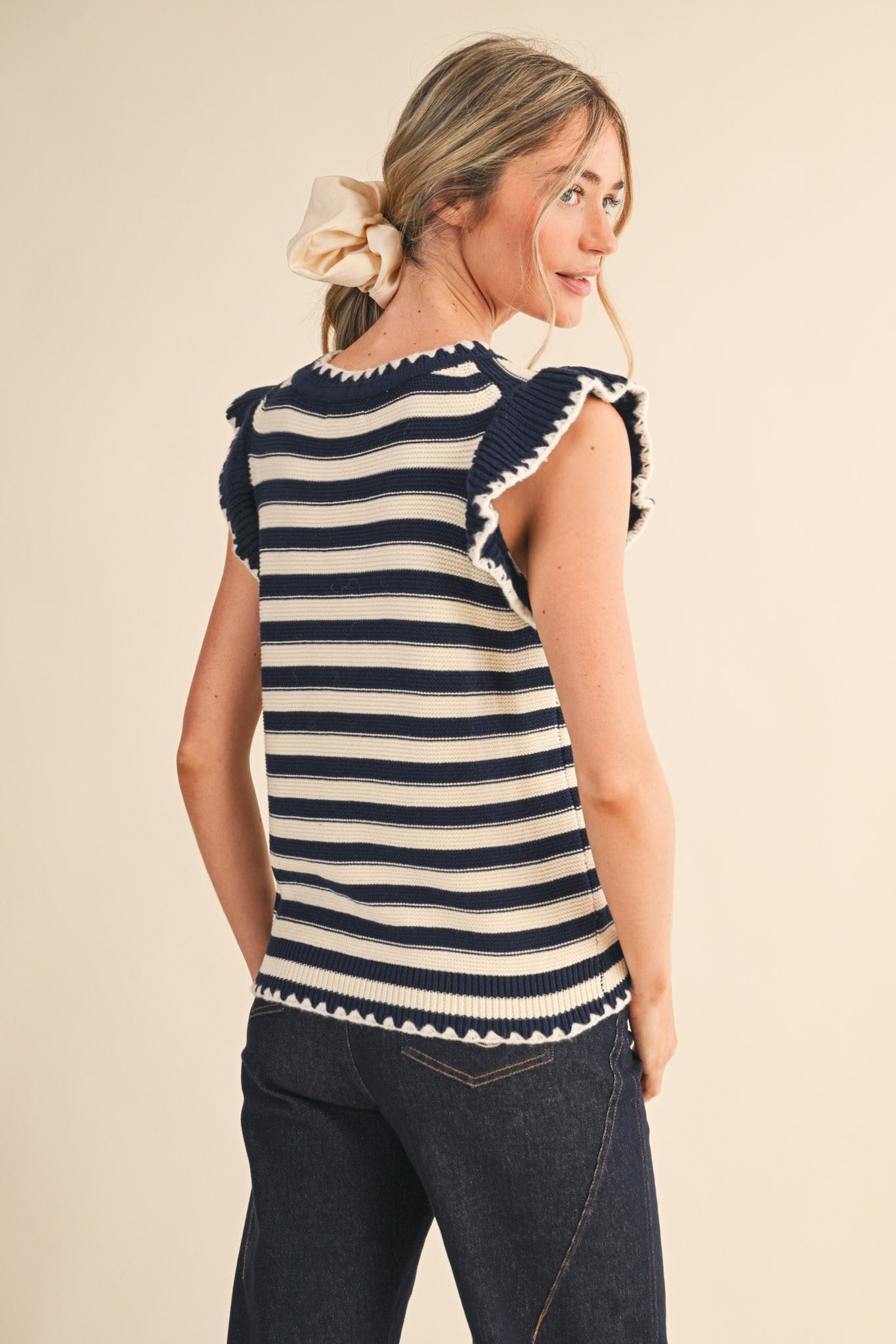 Lightweight striped sweater featuring delicate flutter sleeves for effortless movement and visual interest. The classic stripe pattern pairs seamlessly with everyday basics or layered pieces, while the soft knit construction offers comfort without bulk. Perfect for transitional seasons or layering year-round.