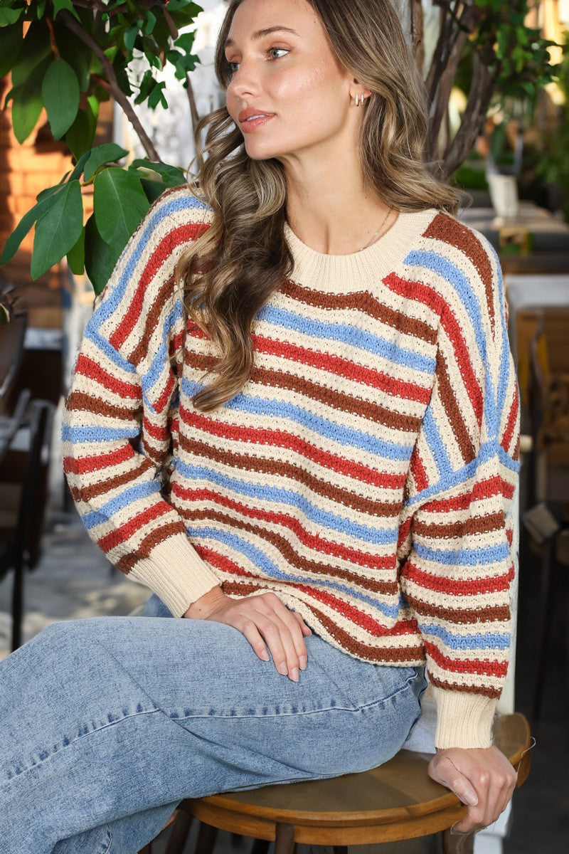 Layered texture meets classic stripes in this crew neck knit. The multi-stripe pattern adds visual interest while the textured knit delivers warmth and dimension. A versatile staple that pairs effortlessly with jeans or tailored pieces for polished everyday style.
