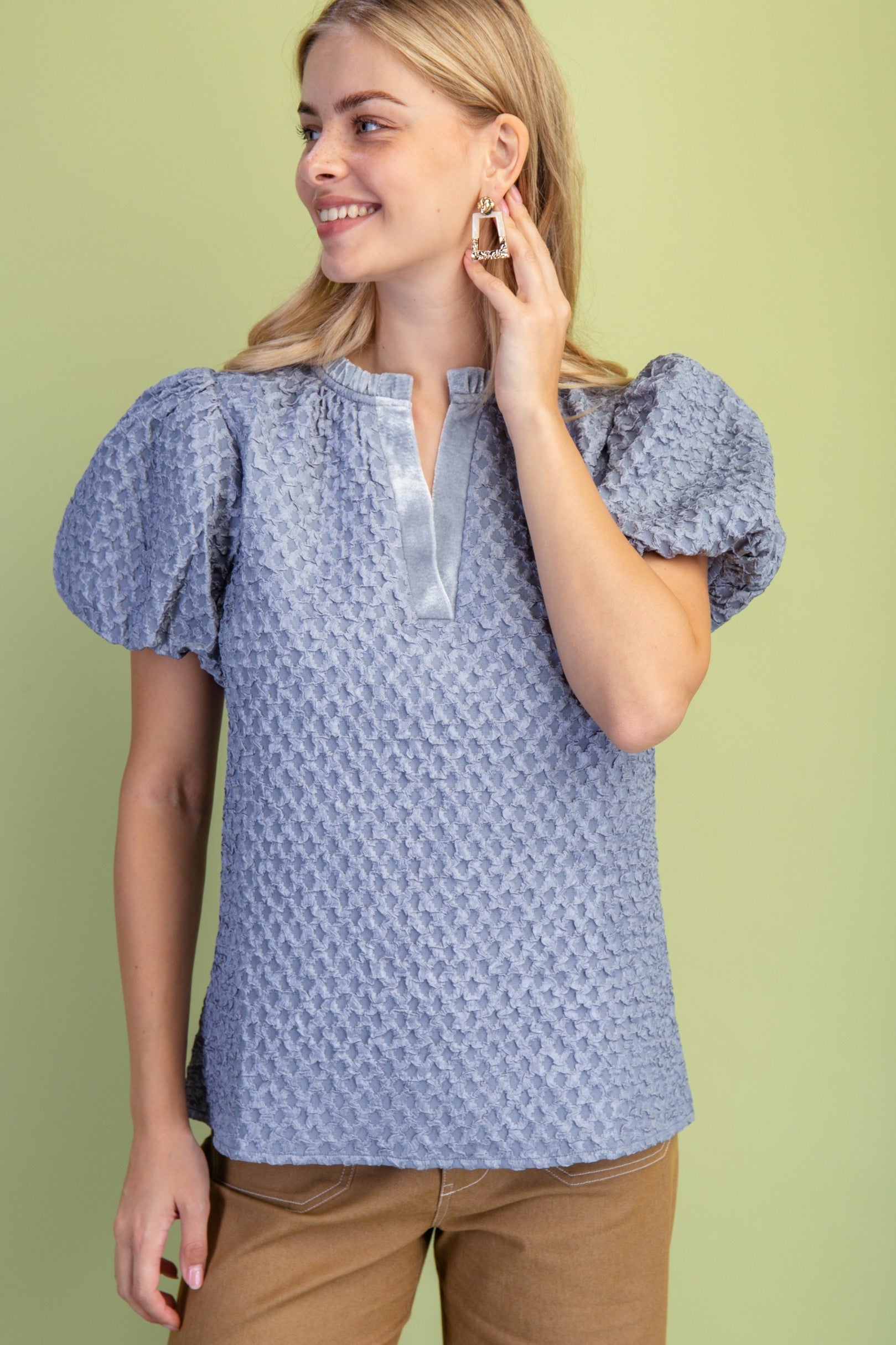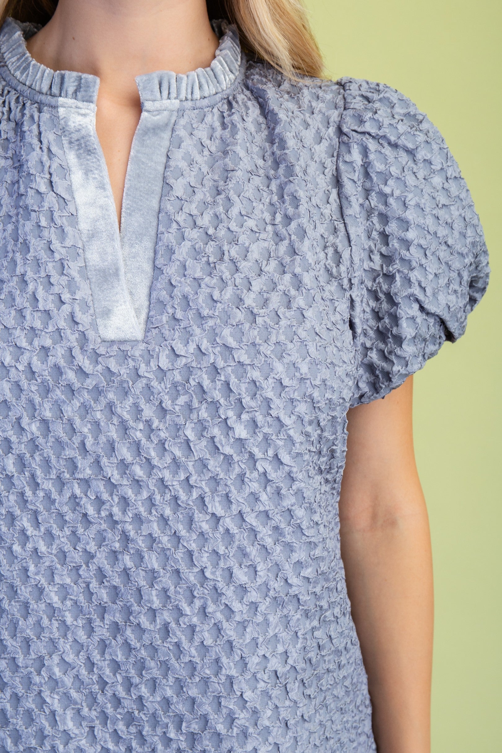 Textured puff sleeve top with velveteen accented ruffled V neck