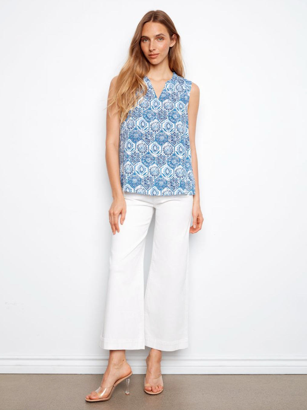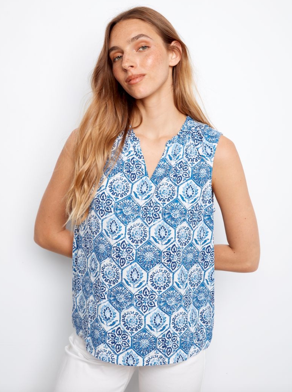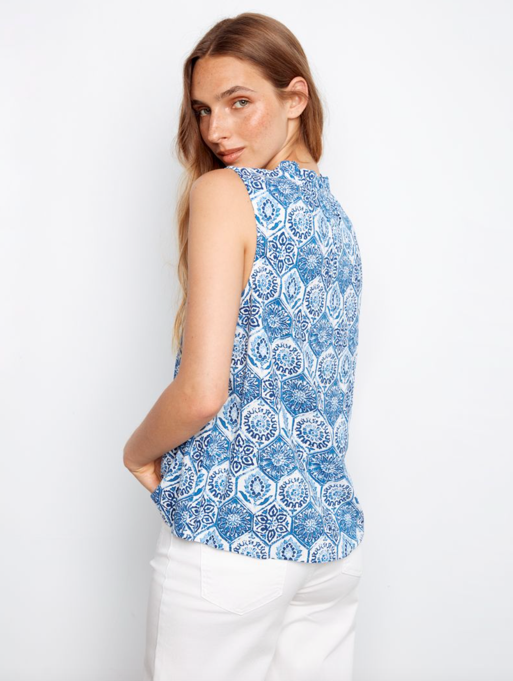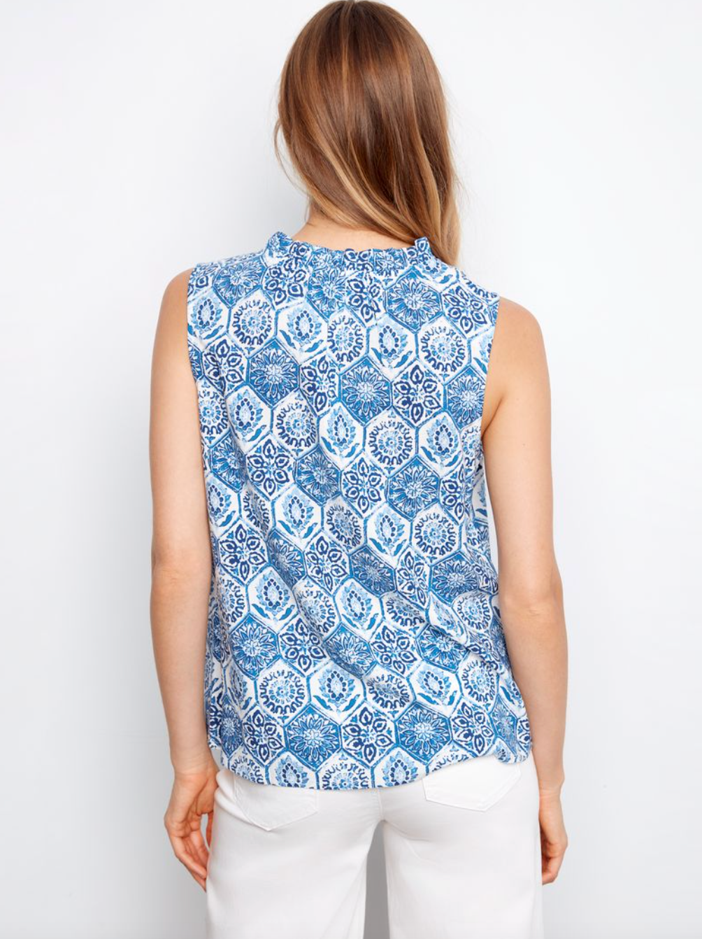 Charlie B Printed Sleeveless Ruffle Neck Top