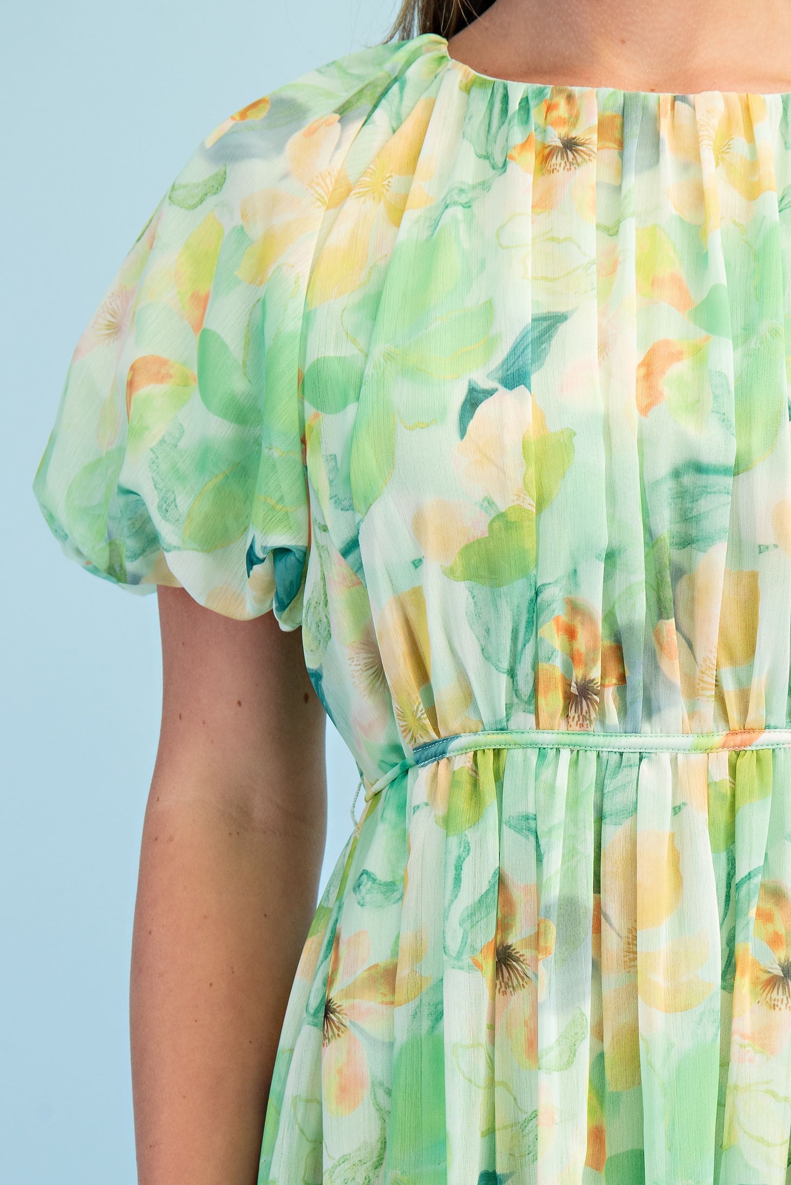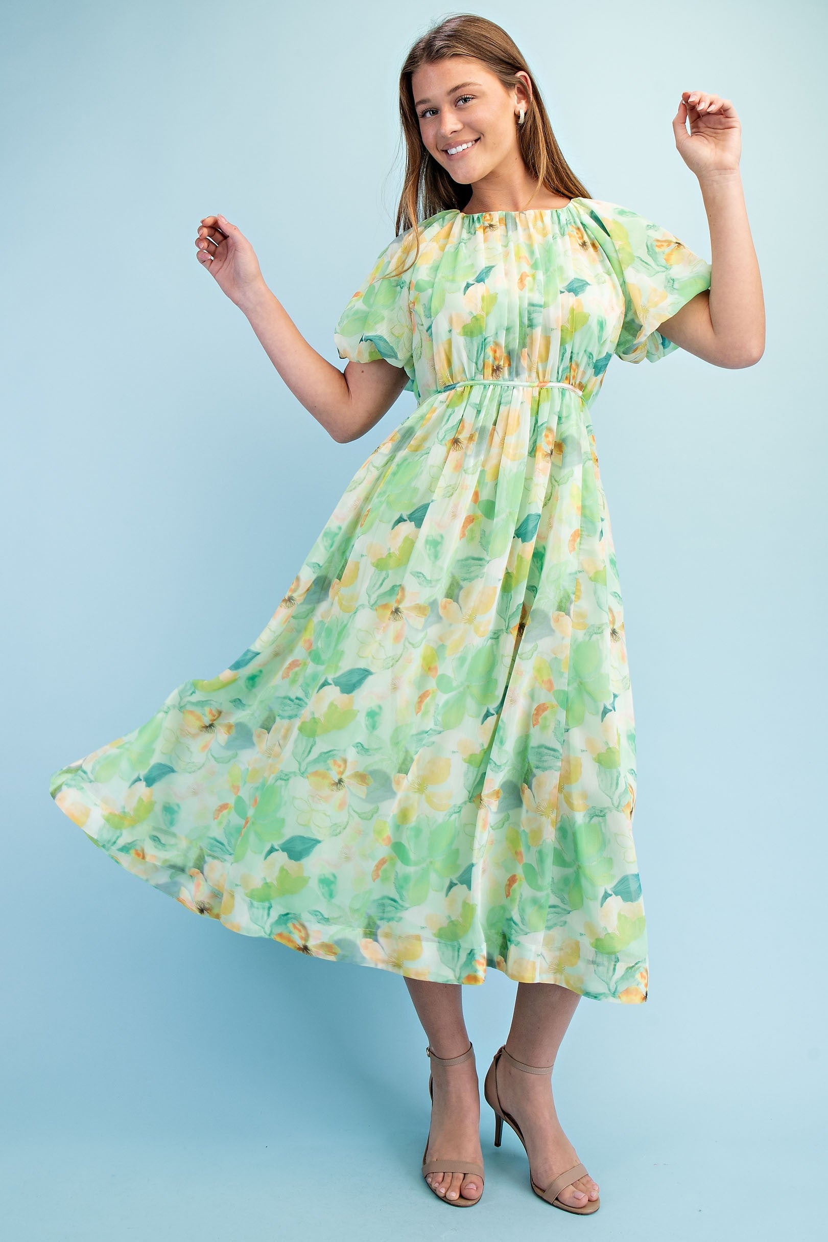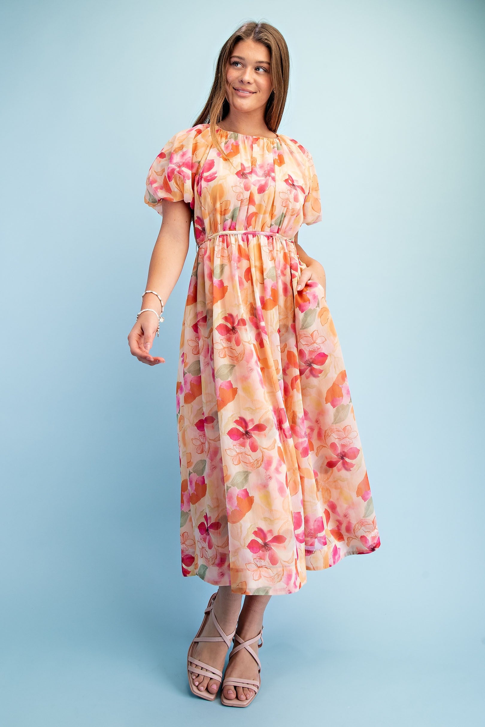 Bright floral short puff sleeve midi dress