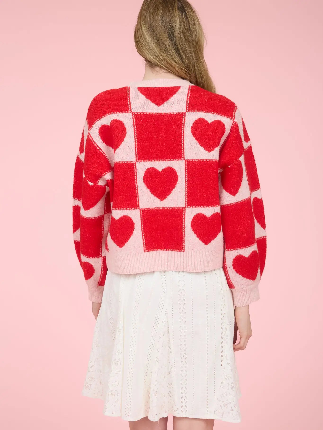Heart Checkered Pattern Crew Neck Knit Sweater