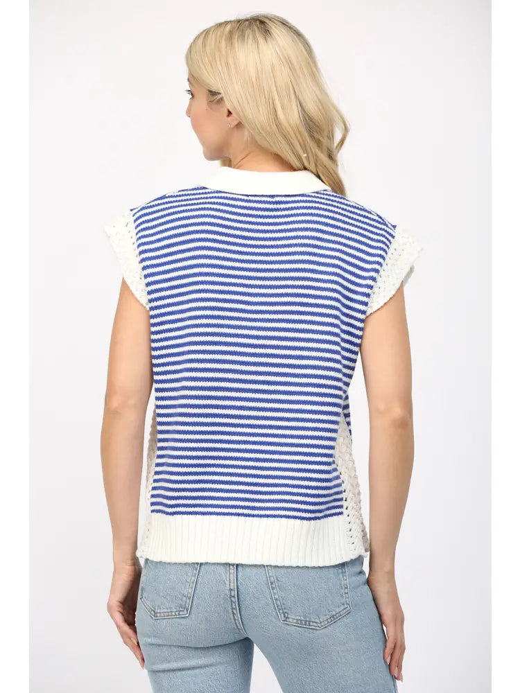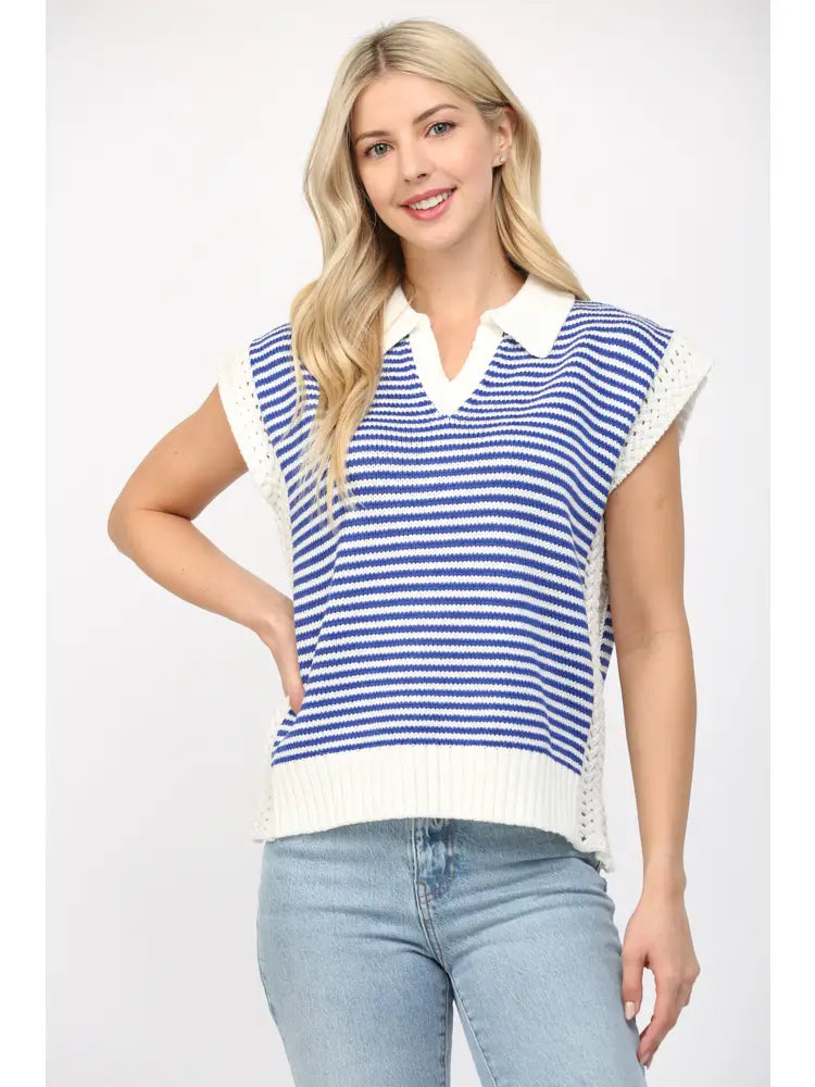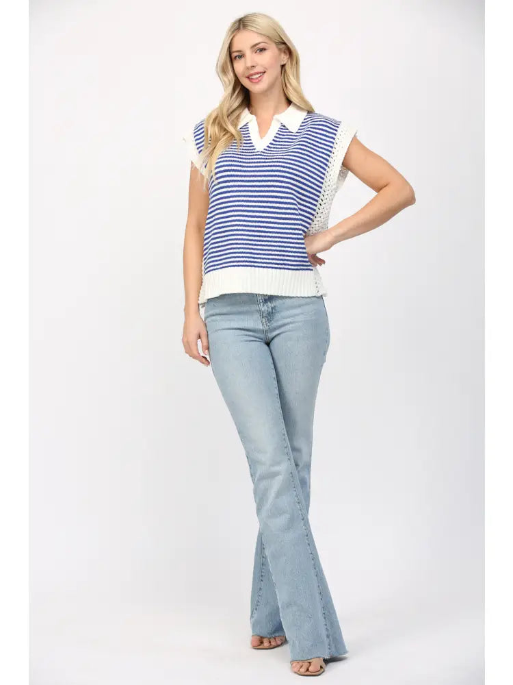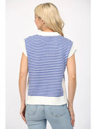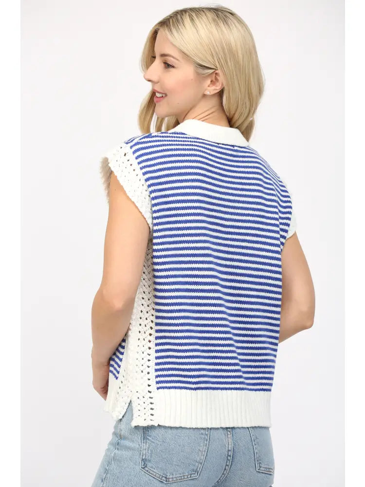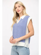 Layering essential with timeless appeal. This striped v-neck sweater vest features a classic collared design that pairs effortlessly over shirts and tees. Crafted for versatility, it transitions seamlessly from casual weekends to polished office settings.