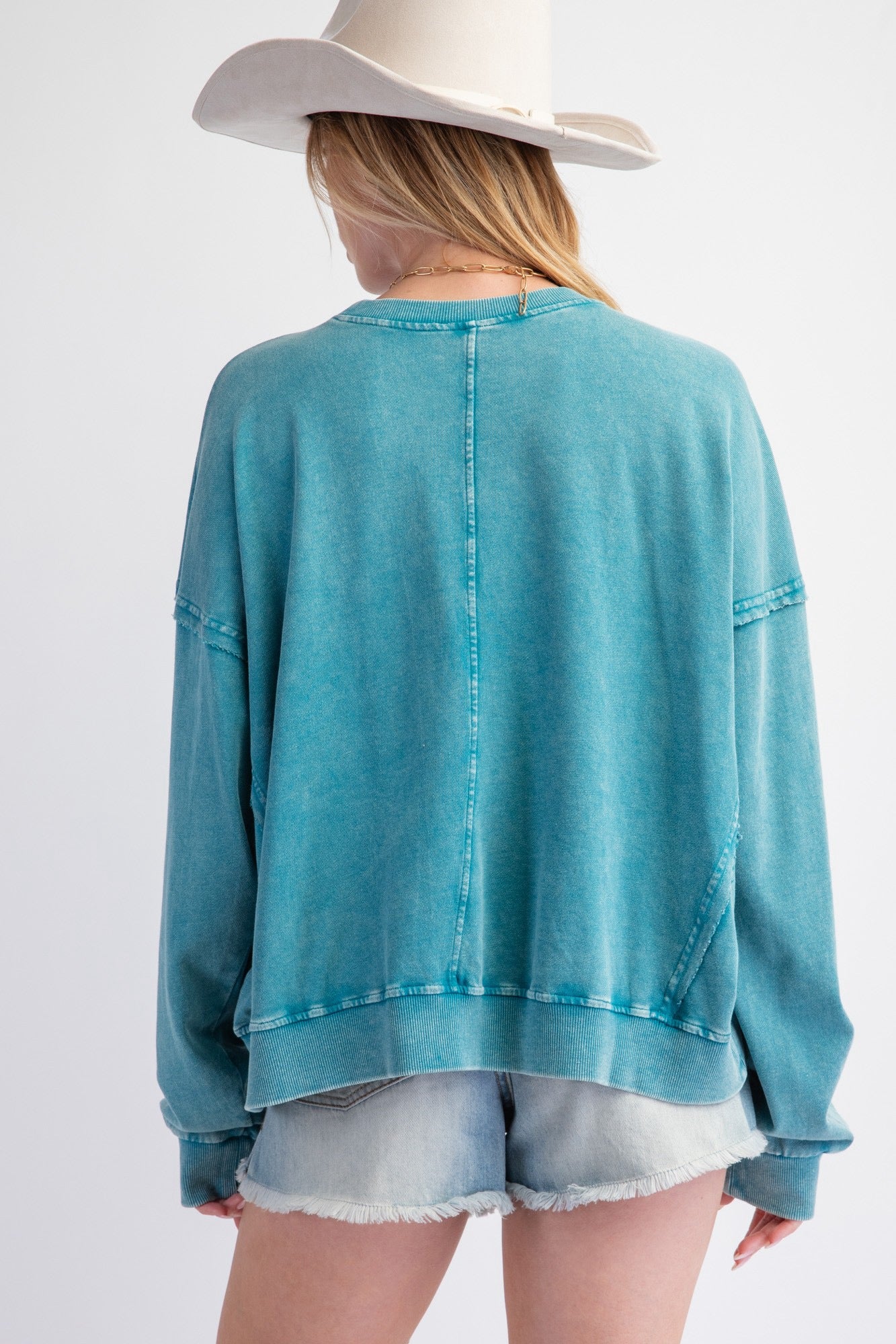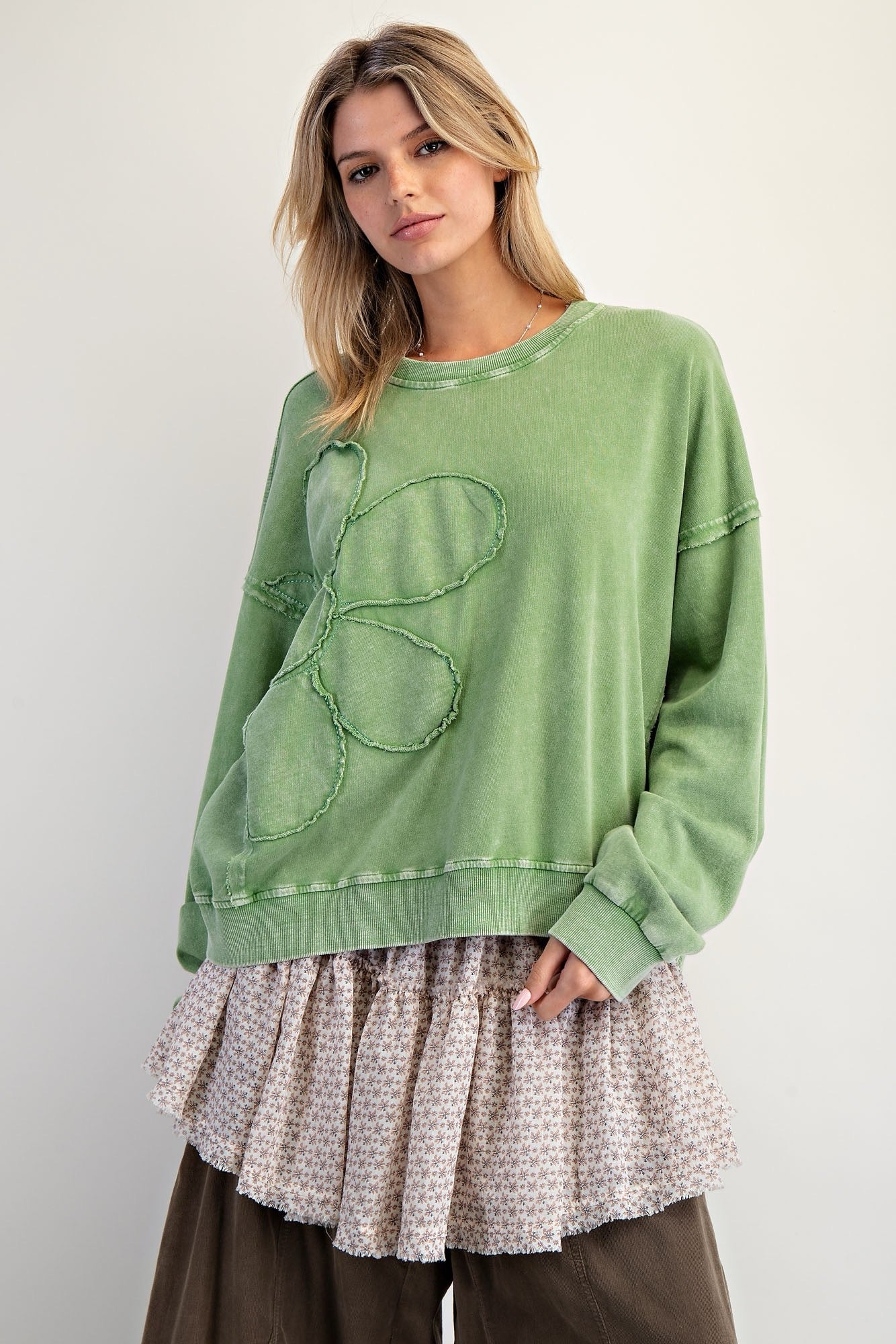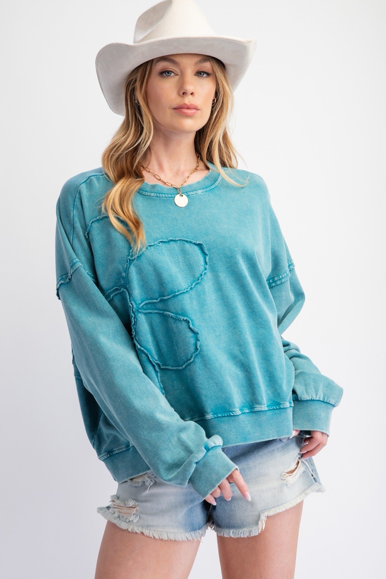 Brighten your day with this Flower Patch Washed Terry Knit Pullover. Soft, cozy fabric meets charming floral patches for a playful, casual look that’s perfect for lounging or light adventures. Its relaxed fit and washed texture add effortless style and comfort to your wardrobe.