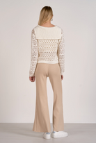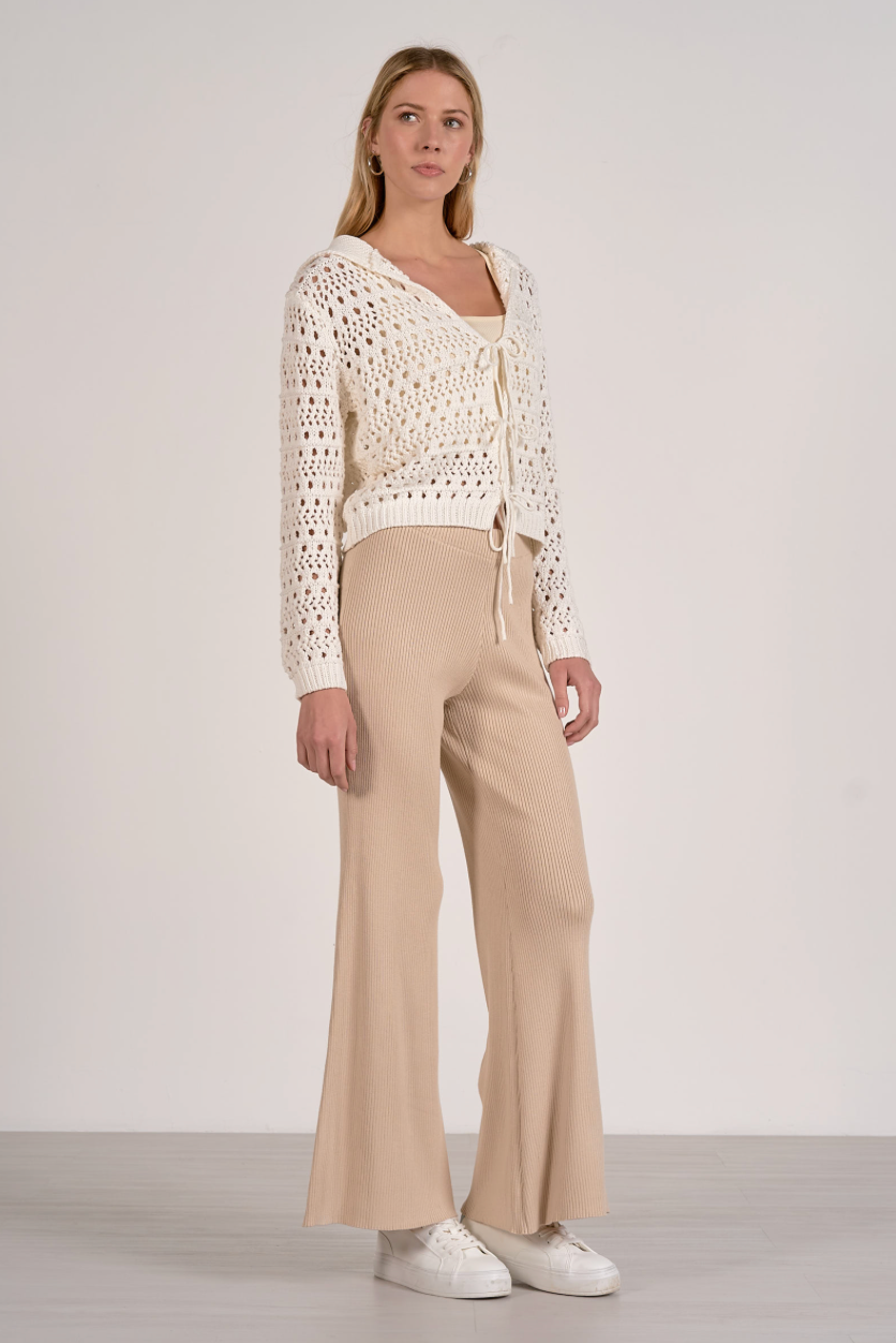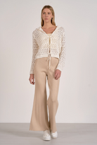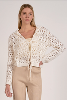 Lightweight open knit construction offers breathable layering without bulk. Three adjustable tie closures at the front allow customizable fit and styling versatility—wear it snug, draped, or partially open for effortless transitions between seasons. Perfect for building polished, intentional looks with minimal effort.