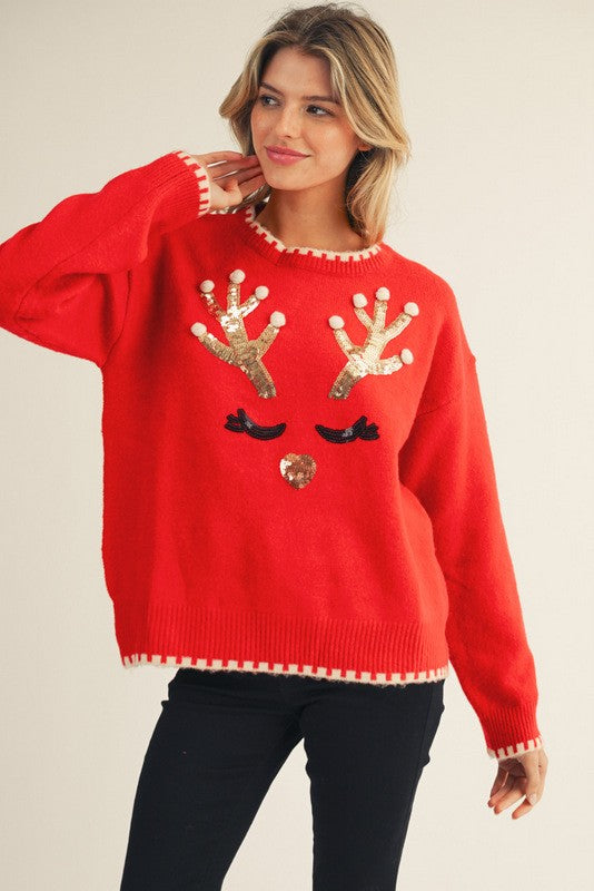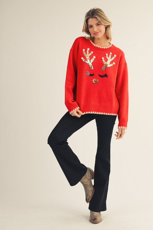Festive charm meets playful style with this sequin-adorned Rudolf sweater. Featuring shimmering details and a classic reindeer design, it's the perfect holiday statement piece. Cozy knit construction keeps you warm while the eye-catching sequins add sparkle to any seasonal gathering. A fun, conversation-starting essential for the festive season.