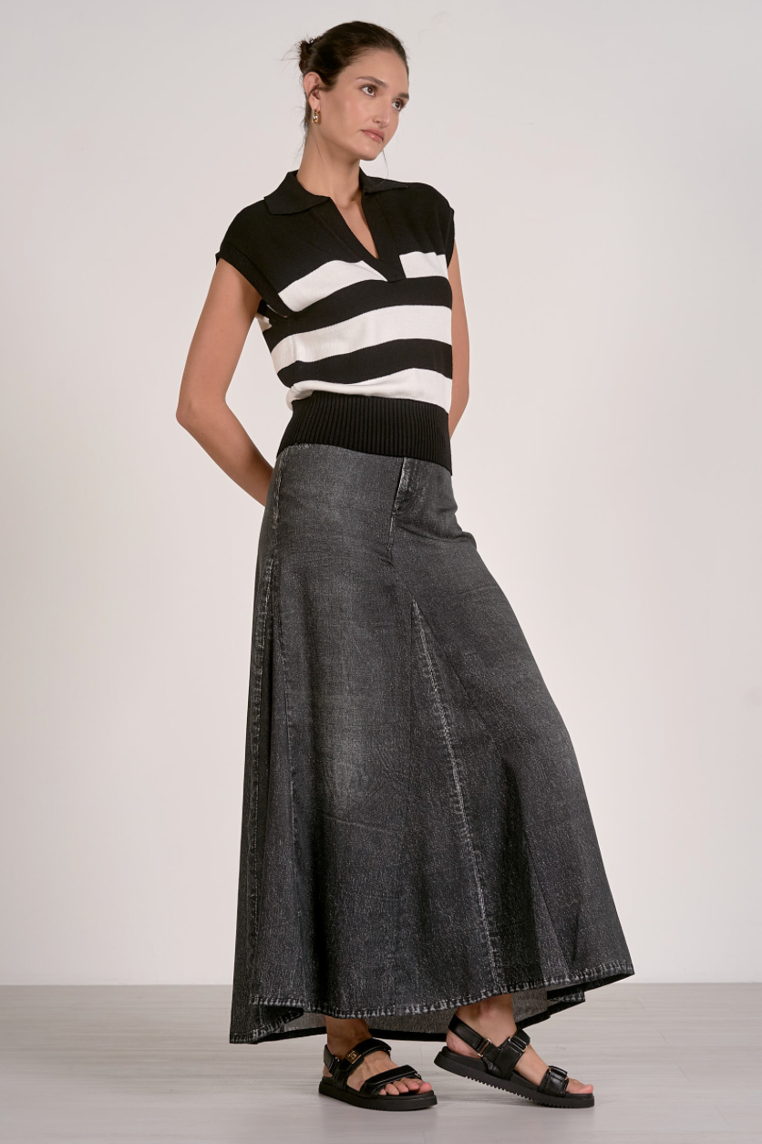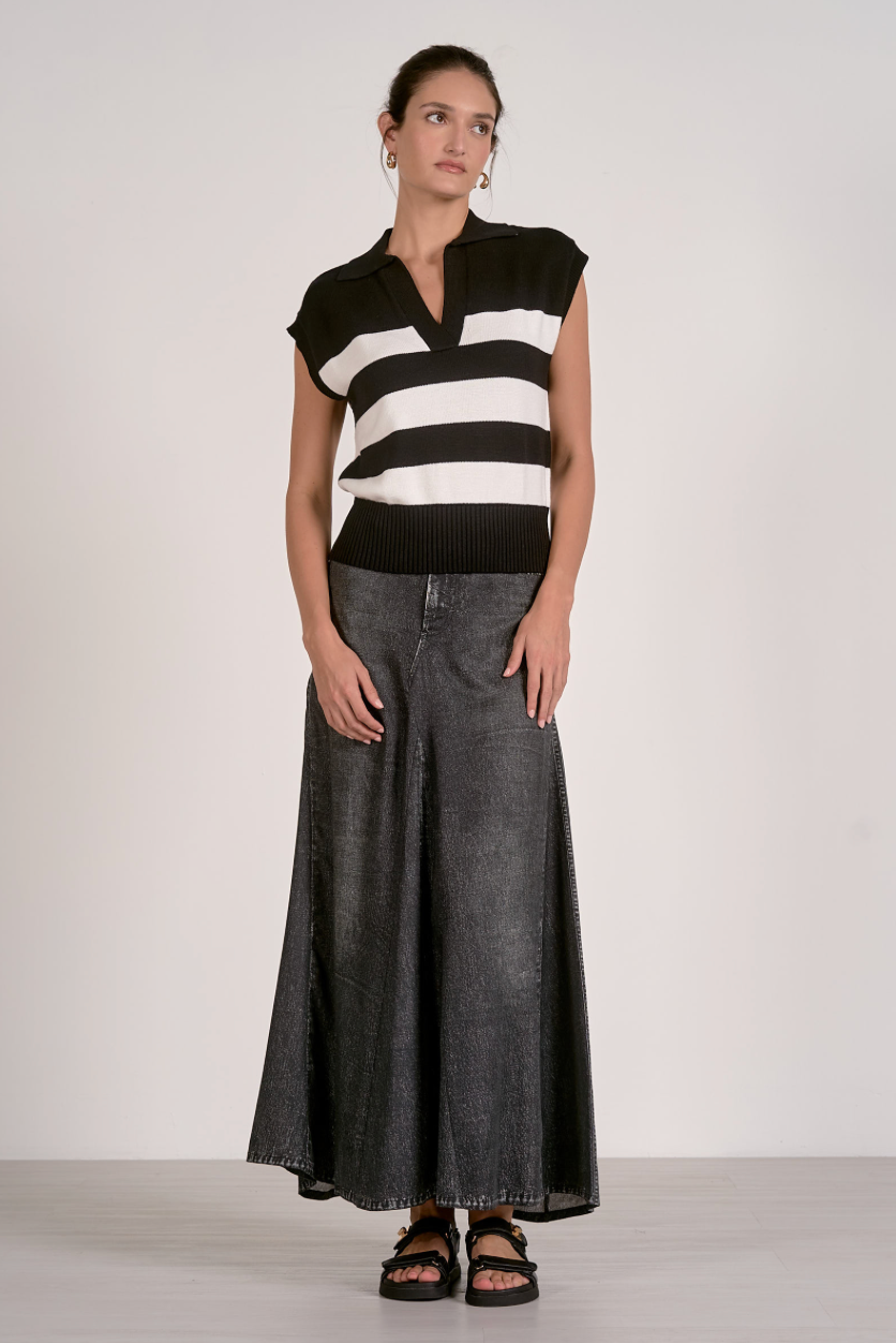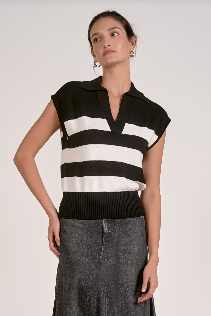 Timeless striped knit with a refined collar detail and sleeveless silhouette. The structured neckline adds polish while the lightweight construction keeps it versatile for layering or solo wear. Perfect for transitional seasons and effortless styling across casual and elevated looks.