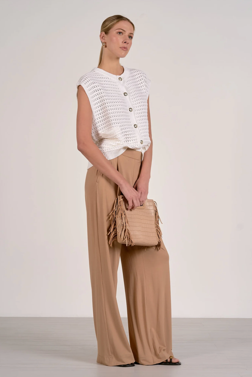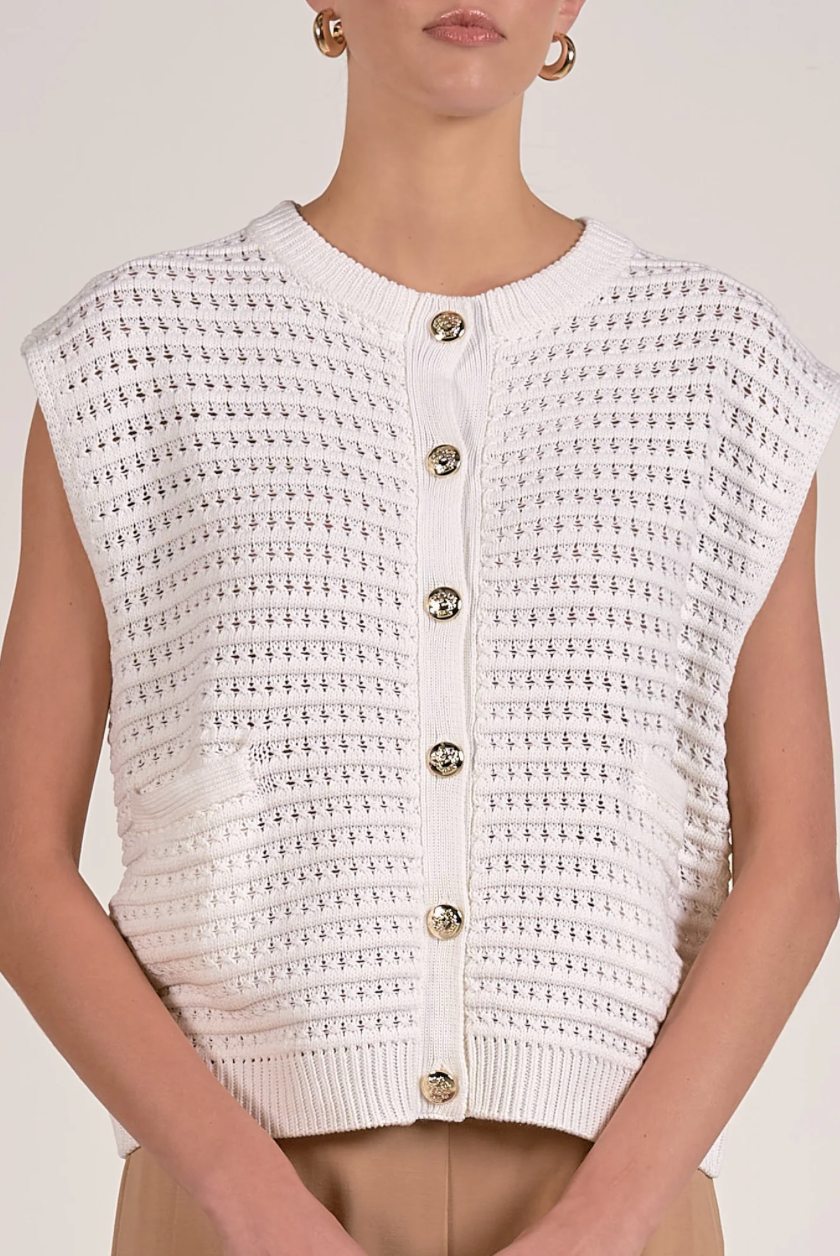 Effortless layering piece that transitions seamlessly from season to season. This sleeveless cardigan delivers refined structure without bulk, making it ideal for building versatile outfits. The sweater knit provides subtle texture and breathability, while the button-front silhouette offers easy styling flexibility. Perfect for layering over basics or wearing solo during warmer months.