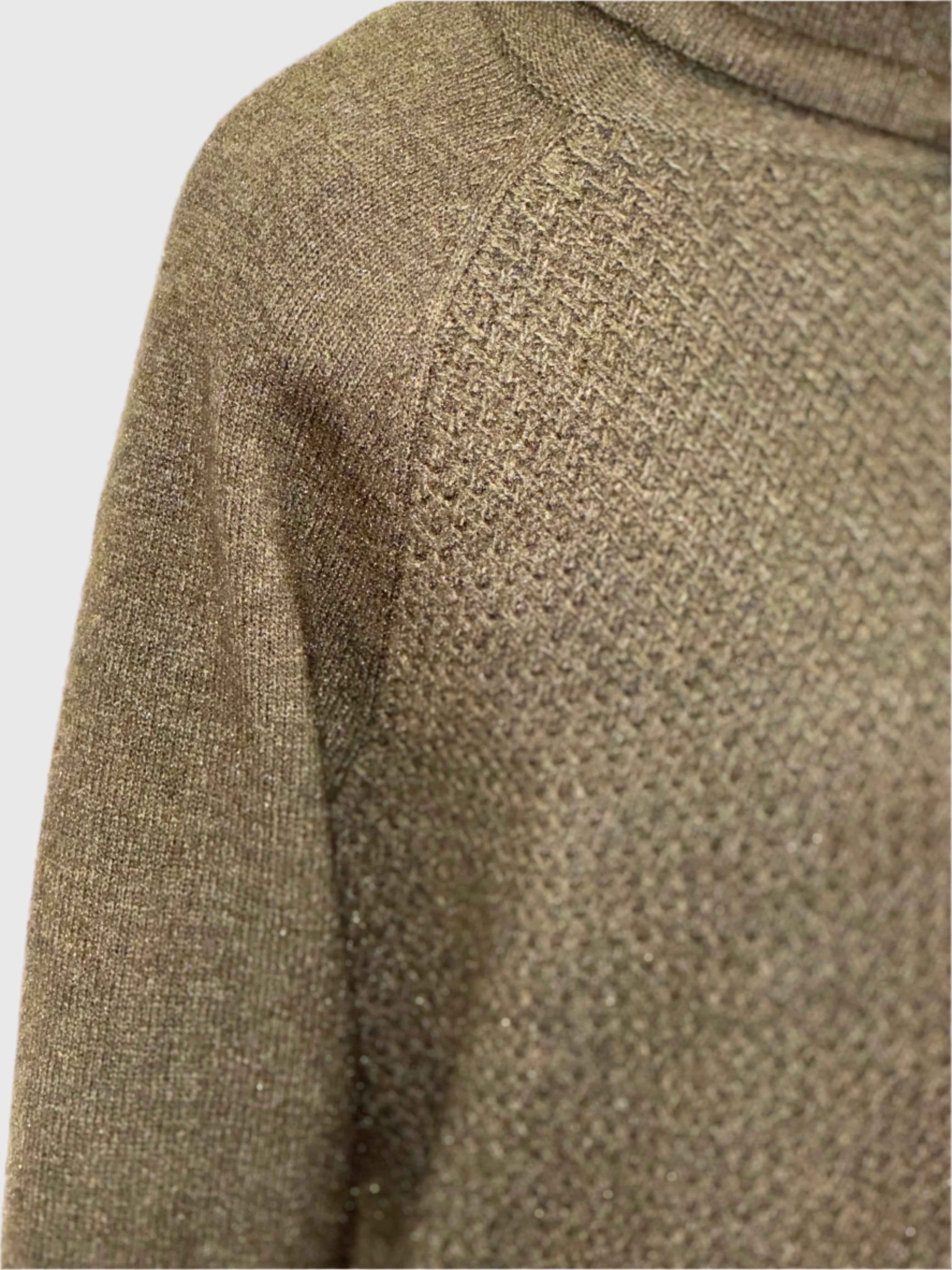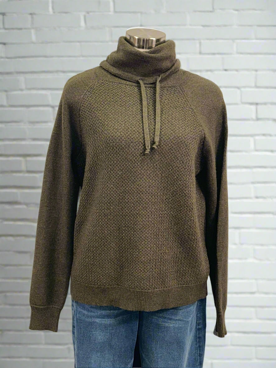 This textured raglan knit sweater features a small cowl neck that adds subtle sophistication to its cozy design. The raglan sleeves provide a comfortable fit and ease of movement, while the textured knit enhances visual interest and warmth. Ideal for layering or wearing on its own, this sweater combines expert craftsmanship with versatile style for a refined yet relaxed look.