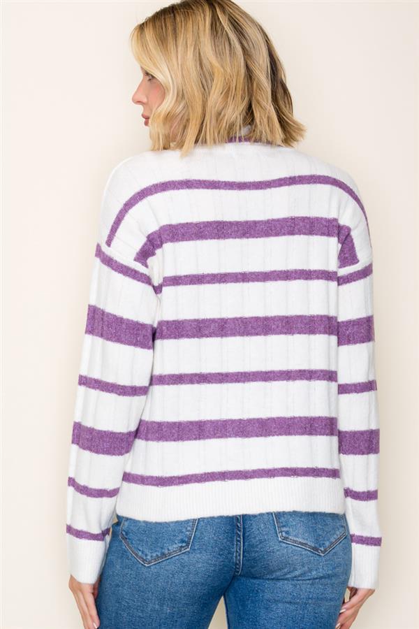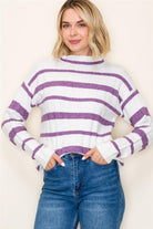 Cozy up in this wide ribbed, mock neck sweater that’s all about comfort and style. Its long sleeves and super soft fabric make chilly days feel like a warm hug, while playful stripes add a fun twist to your look. Perfect for layering or rocking solo, this pullover keeps you snug and stylish with a cheeky flair!