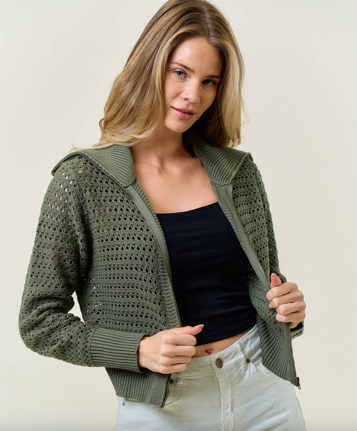 Stay cozy and effortlessly stylish with this zip-up pointelle open knit sweater jacket. Its delicate open knit pattern adds a fun, airy texture, perfect for layering over your favorite tops. The zip-up front lets you customize your look, whether you're rocking it open for a casual vibe or zipped up for extra warmth. Light and breathable, this sweater jacket blends comfort with playful charm for every season.