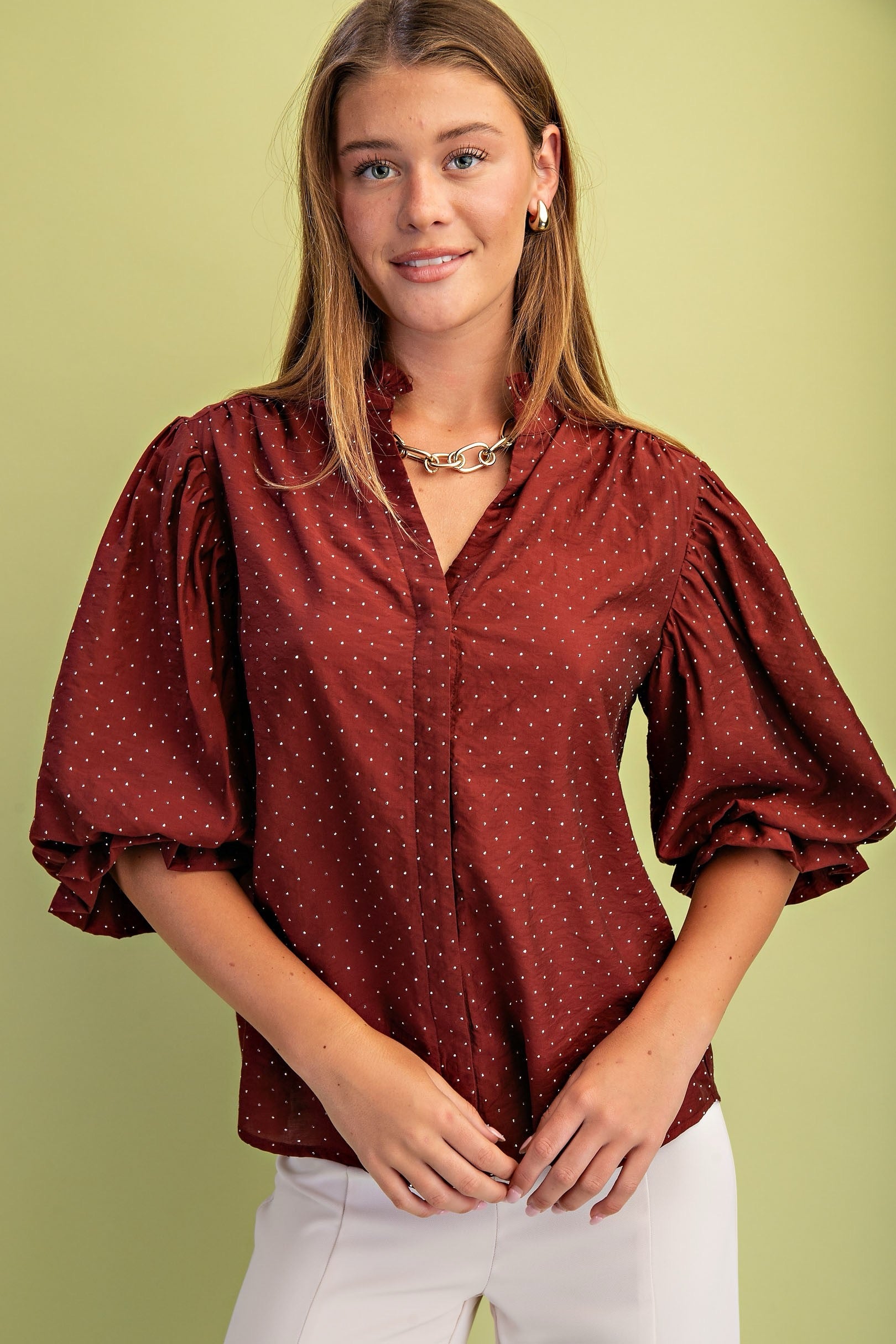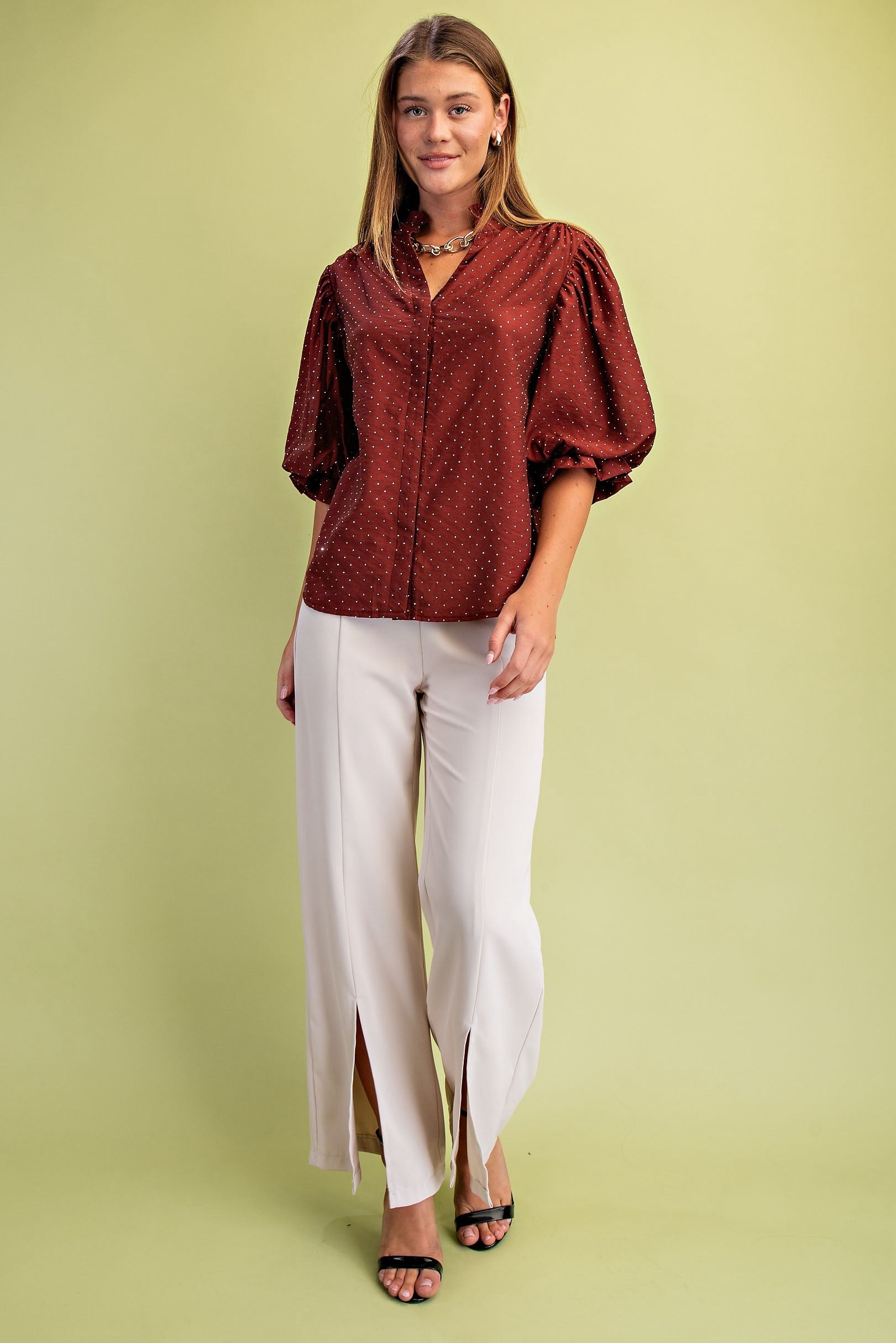 3/4 length gathered balloon sleeve blouse with rhinestone embellishments