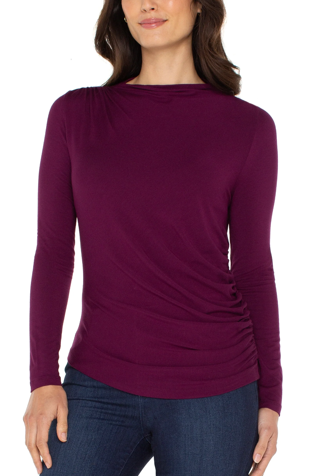 A refined essential with a modern twist. This long sleeve knit top features a sleek mock neck and artful shirring at the shoulder and hip, creating a softly draped, flattering silhouette. Perfect for dressing up denim or layering under tailored pieces, it’s the effortless staple your wardrobe’s been waiting for.