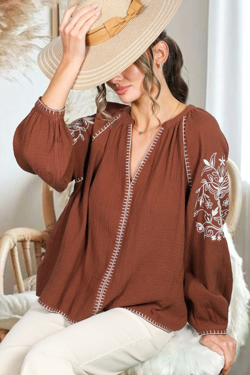 This blouse brings a burst of floral charm with beautifully embroidered designs on soft fabric. Featuring long raglan sleeves, it offers a relaxed fit that moves with you, perfect for playful days and breezy evenings. Add a touch of whimsy to your wardrobe with this effortlessly stylish top.