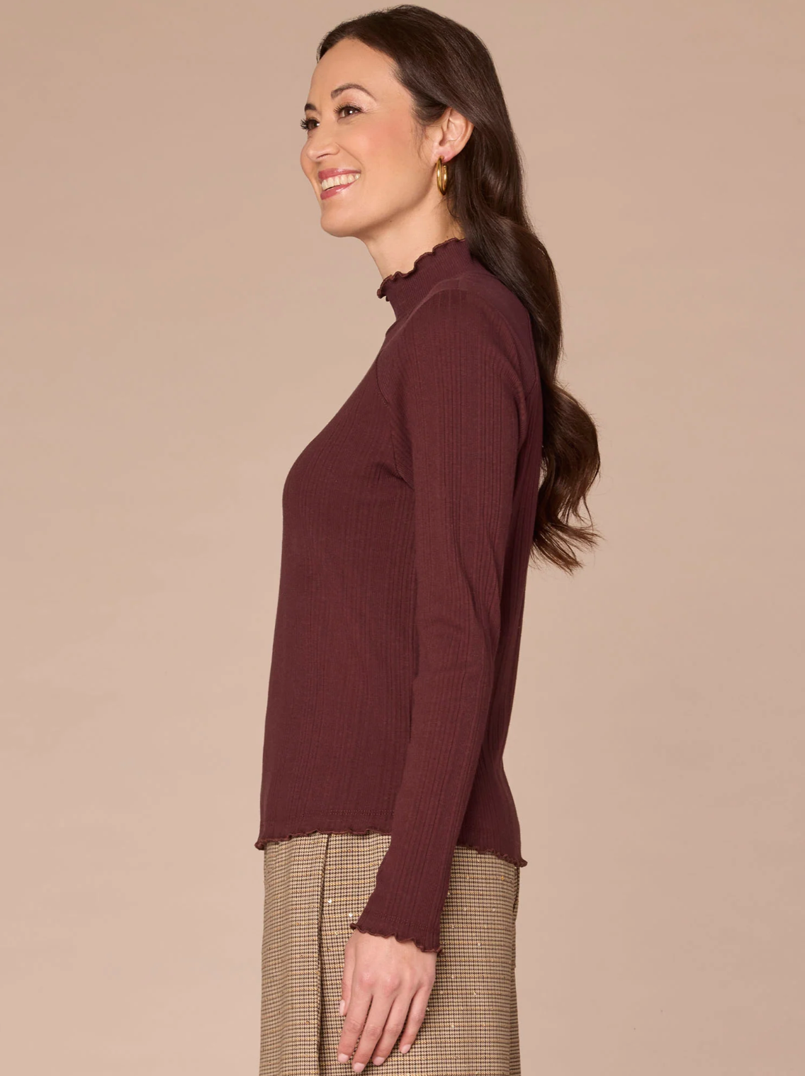 This mixed media knit top is endlessly versatile, with long sleeves, a mock neck, seaming detail, and a straight hem. Wear it on its own for an easily polished look or style it under a layer with the chic lettuce edge details popping through.