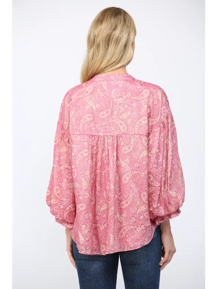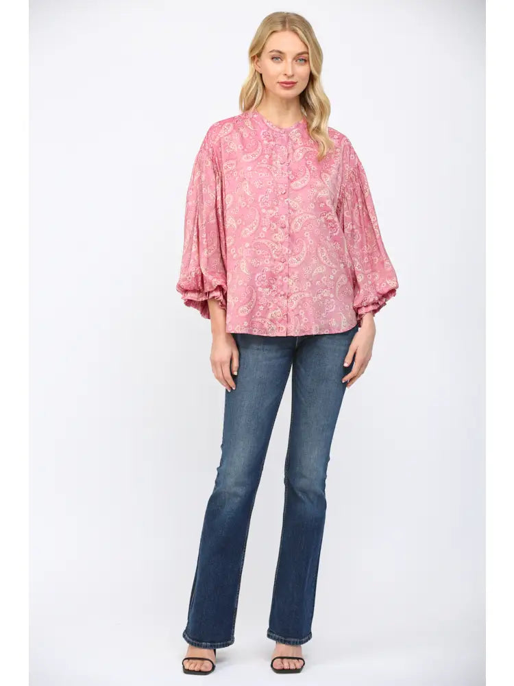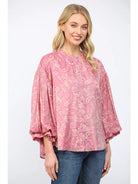 Paisley Print Voluminous Bubble Slv Blouse Make a statement with this eye-catching blouse featuring an intricate paisley print and dramatic bubble sleeves. The voluminous silhouette creates movement and dimension, while the structured sleeve design adds contemporary flair.