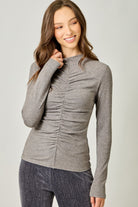 Elevate your style with this playful ruched mock neck top that adds a fun twist to classic elegance. The gathered ruching creates a flattering silhouette while the mock neck offers a chic, cozy vibe. Perfect for layering or wearing solo, this top effortlessly blends comfort with a touch of flair for any casual or dressy occasion.
