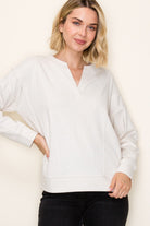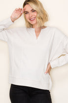 This contemporary long sleeve pullover features a distinctive split neckline that adds modern sophistication to your everyday wardrobe. The rawedge seam detailing delivers an intentional, fashion-forward aesthetic that elevates casual styling.