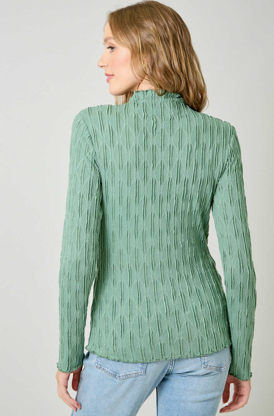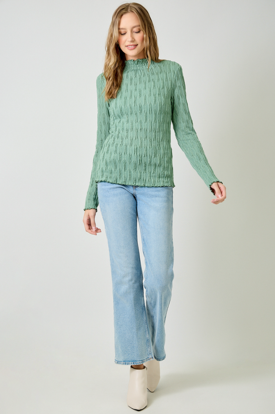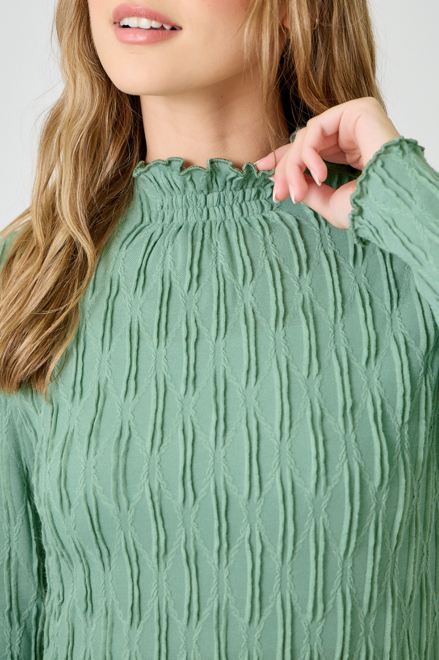 This textured knit top features a stretchy ruched mock neck and long sleeves for a cozy yet chic fit. Its fitted silhouette hugs your shape, making it perfect for layering or wearing on its own with a fun, flirty vibe.