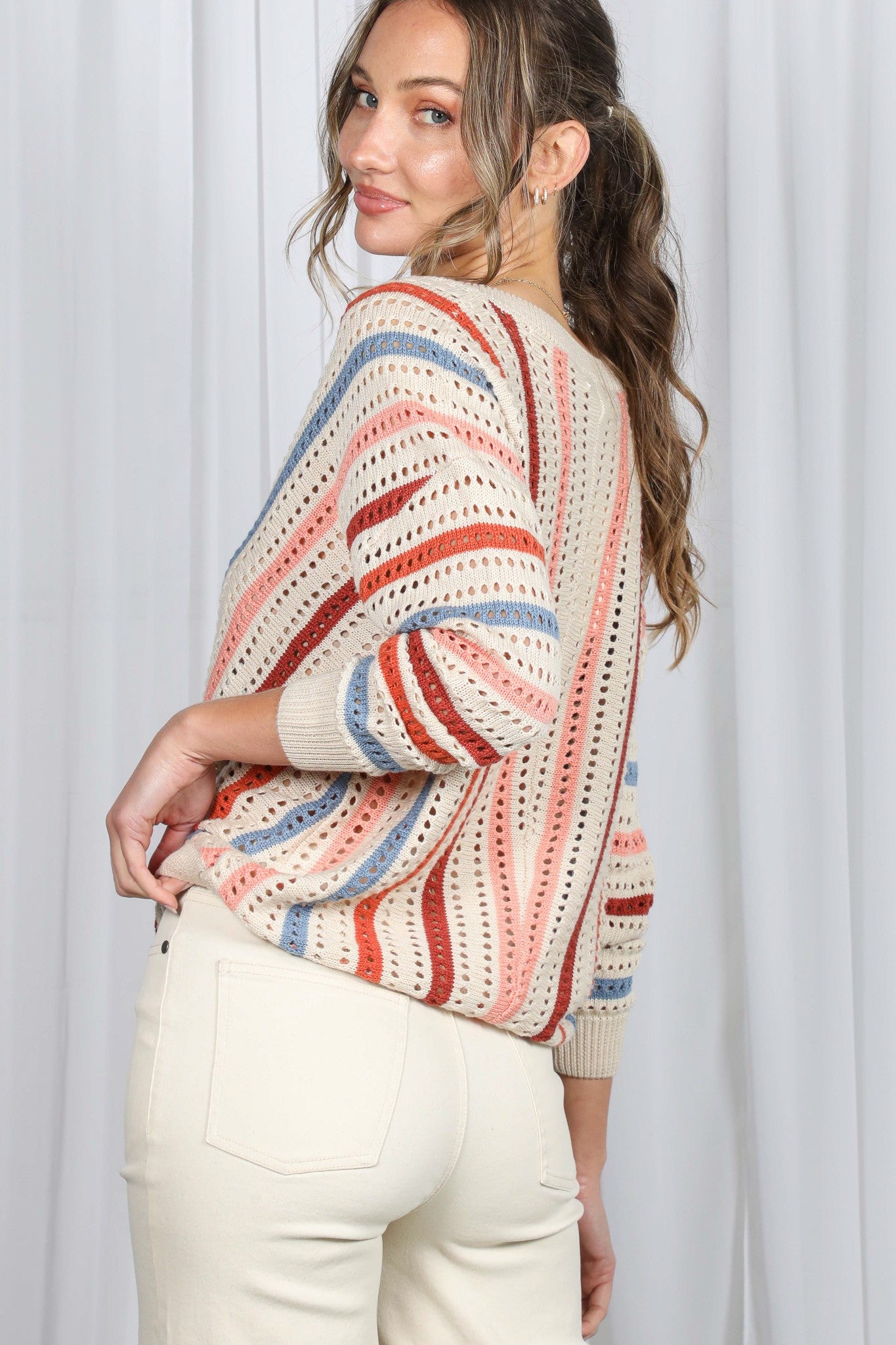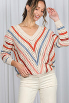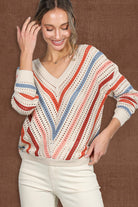 Lightweight knit sweater featuring a flattering V-neckline and allover striped pattern with strategic hollow-out detailing for modern appeal. The relaxed fit and breathable construction make it ideal for layering or wearing solo during transitional seasons. Perfect for effortless, contemporary styling.