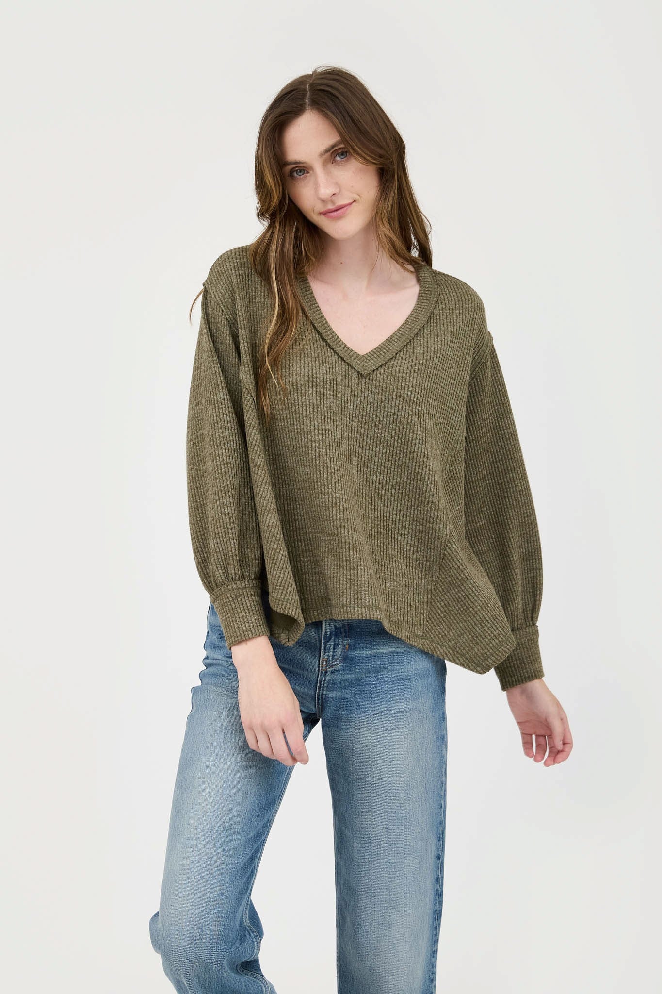 V Neck Asymmetrical hem long sleeve knit top