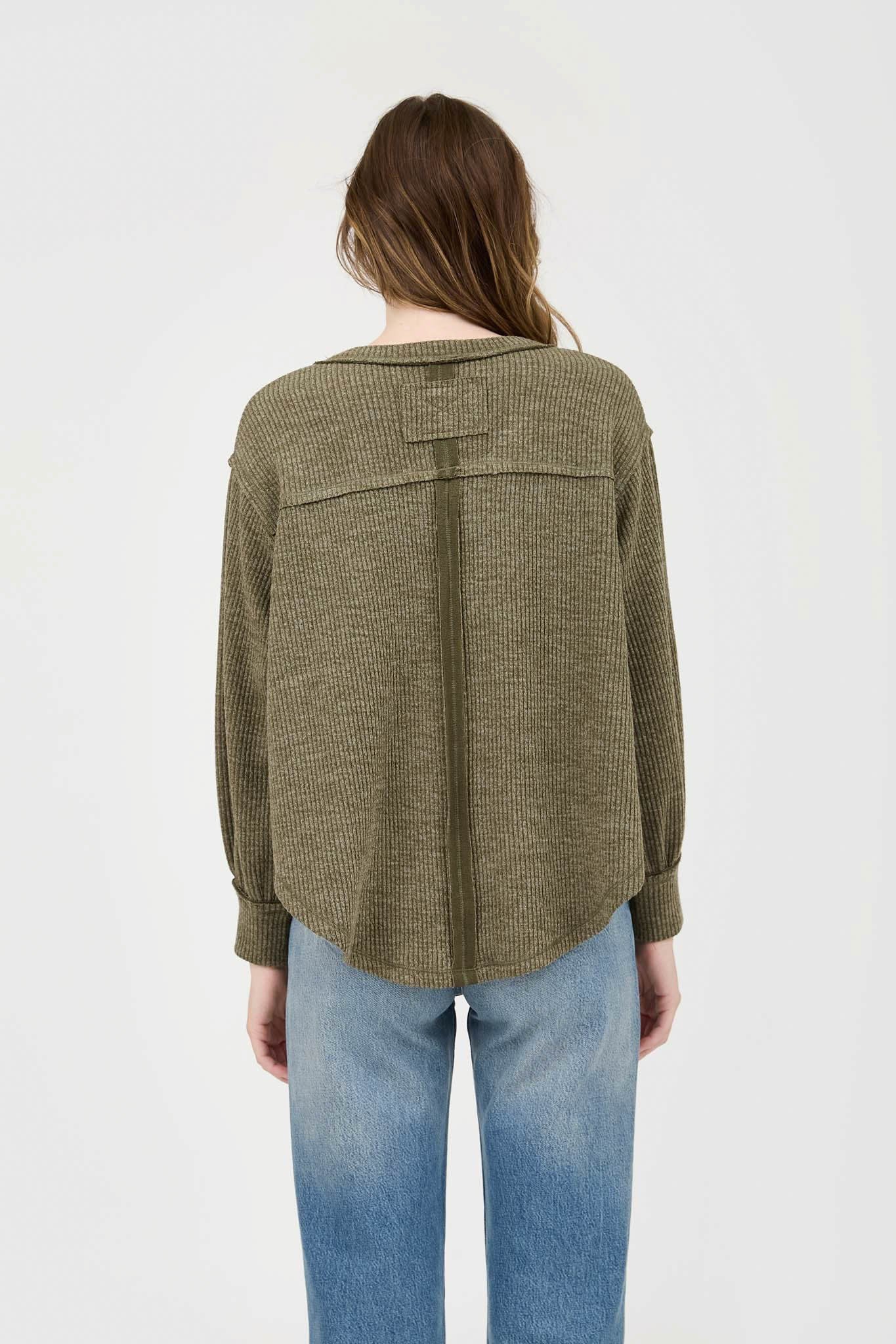 Puff sleeve henley shell button sweater