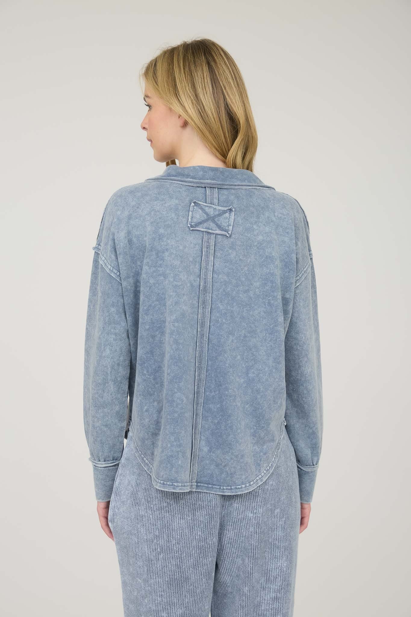 Washed long sleeve U hem polo knit top