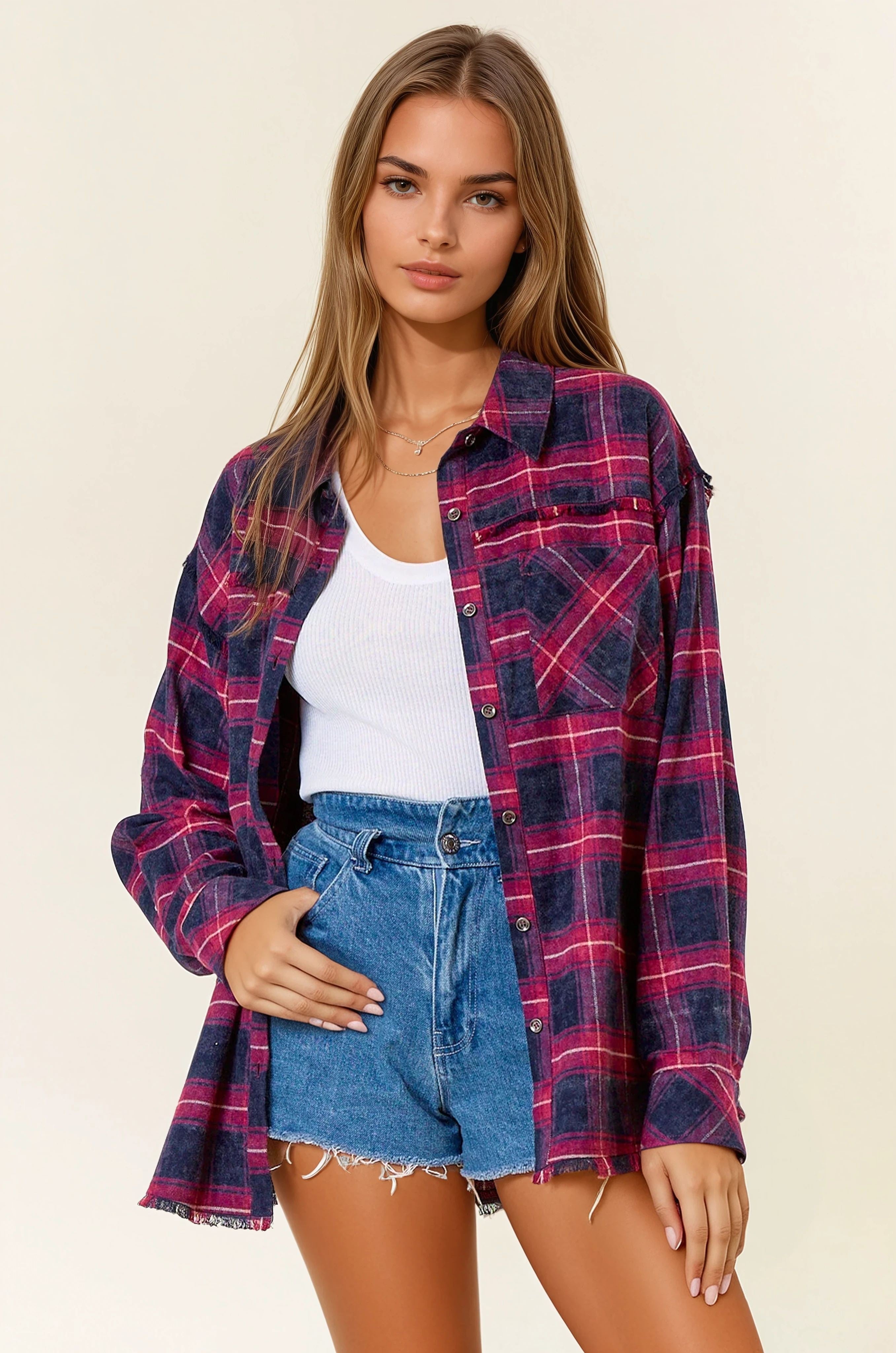 Plaid flannel shirt with frayed detail