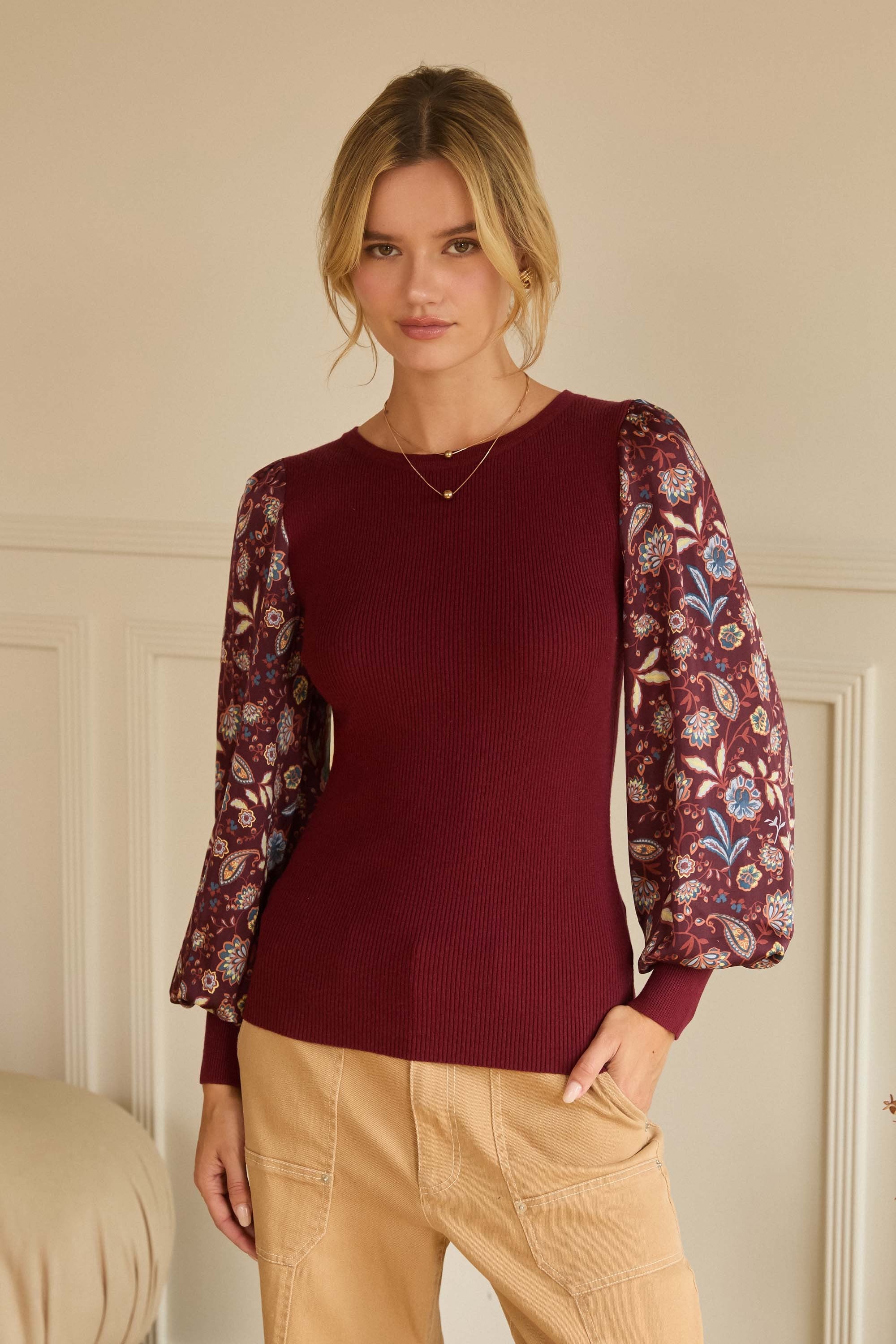 Floral Jacquard Contrast Sleeve knit top