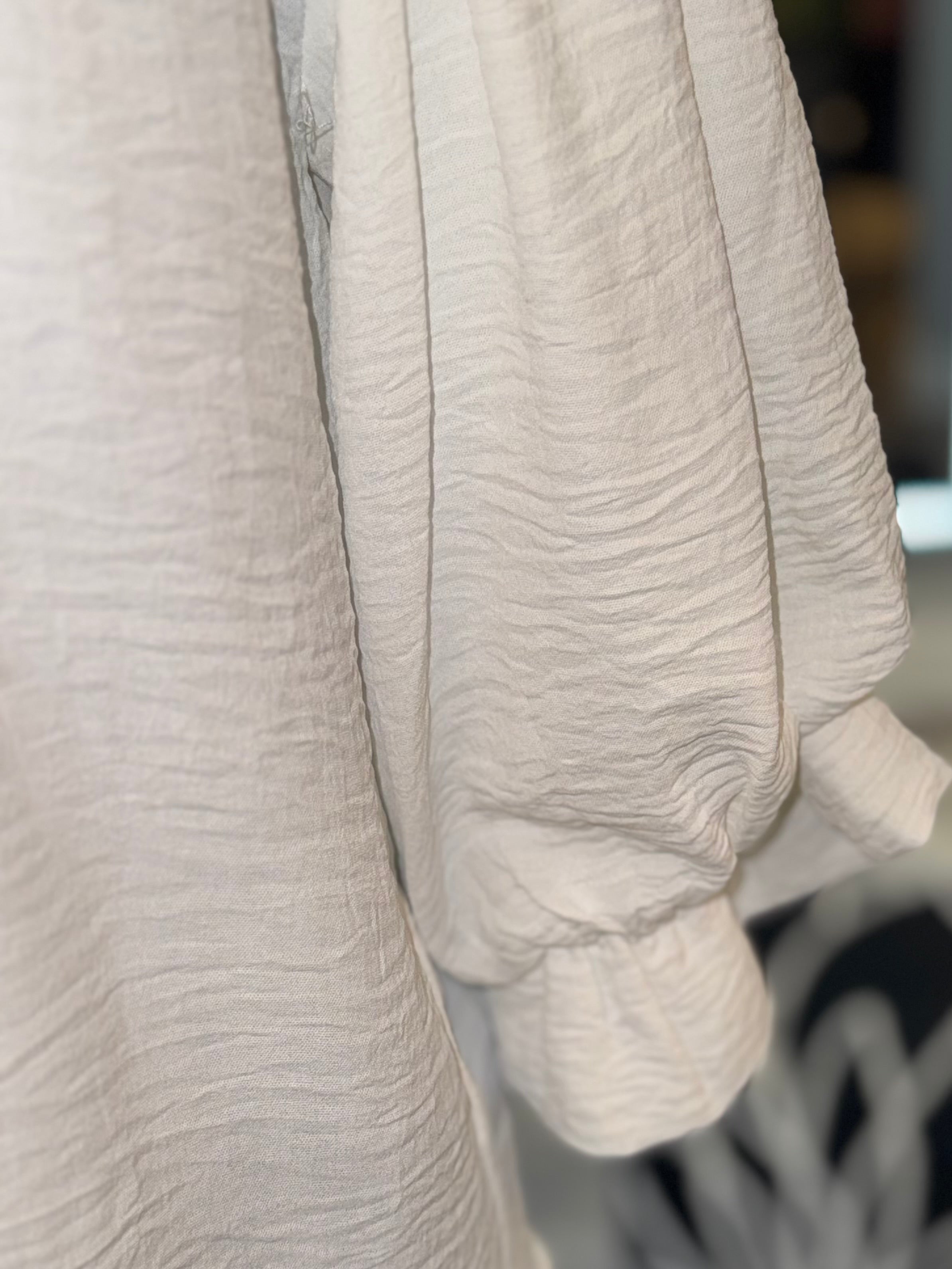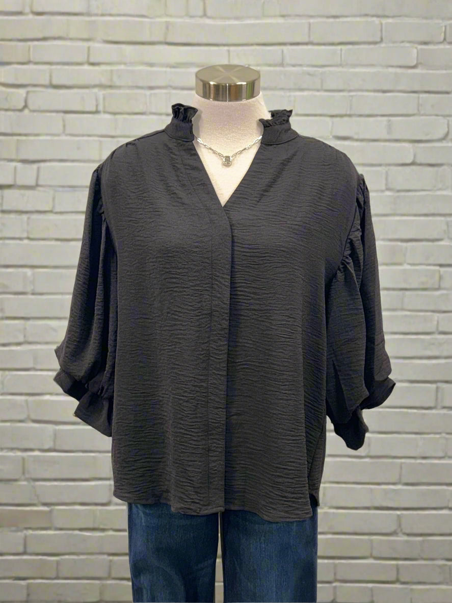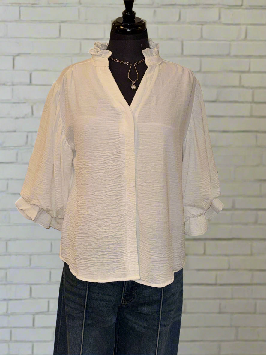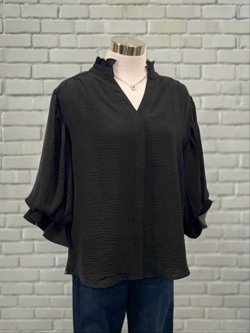 This 3/4 balloon sleeve blouse combines elegant volume with a tailored fit, offering a sophisticated silhouette suitable for both professional and casual settings. The three-quarter length sleeves provide comfort and ease of movement, while the balloon design adds a refined, contemporary touch. Crafted to balance style and practicality, this blouse is an excellent choice for those seeking a polished yet distinctive wardrobe staple.