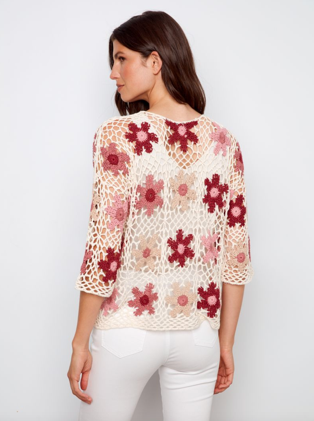 Delicate floral crochet detailing elevates this handcrafted top with artisanal appeal. The intricate openwork design offers breathable comfort while maintaining a polished, feminine silhouette. Perfect for layering or wearing solo, this piece brings textured sophistication to any wardrobe.